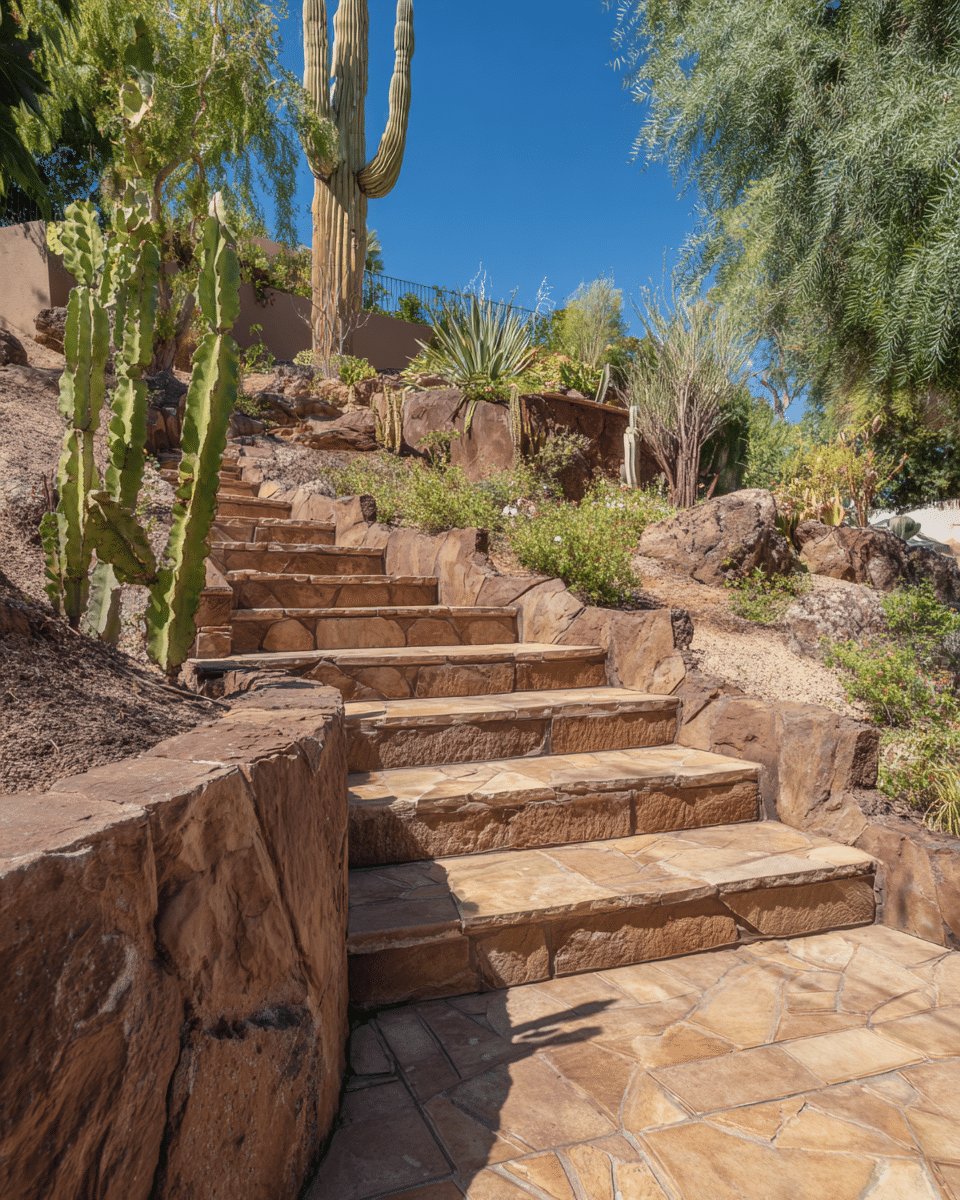 I love how the flagstone steps carve a path through the slope and make the whole yard feel intentional without trying too hard.