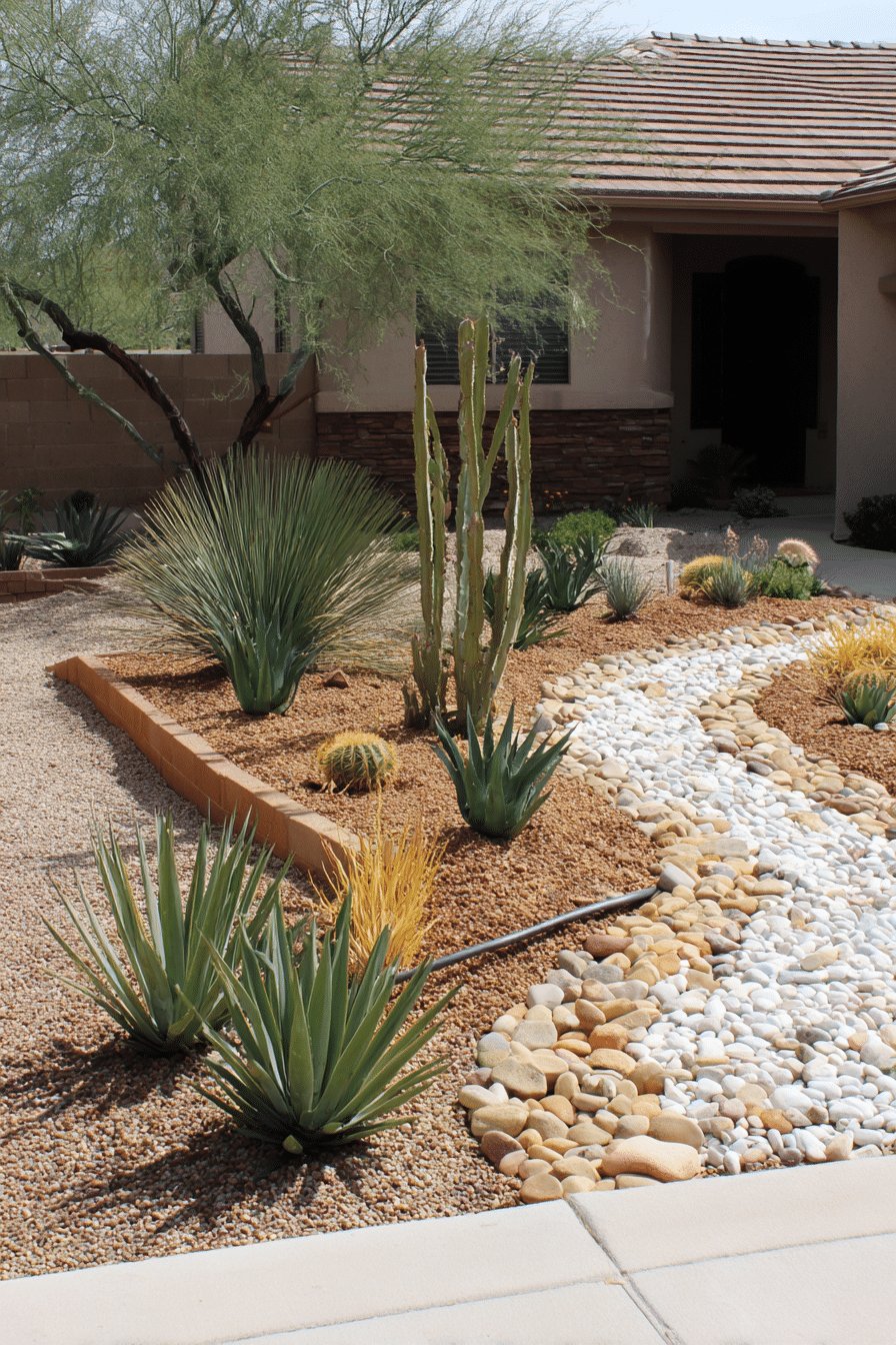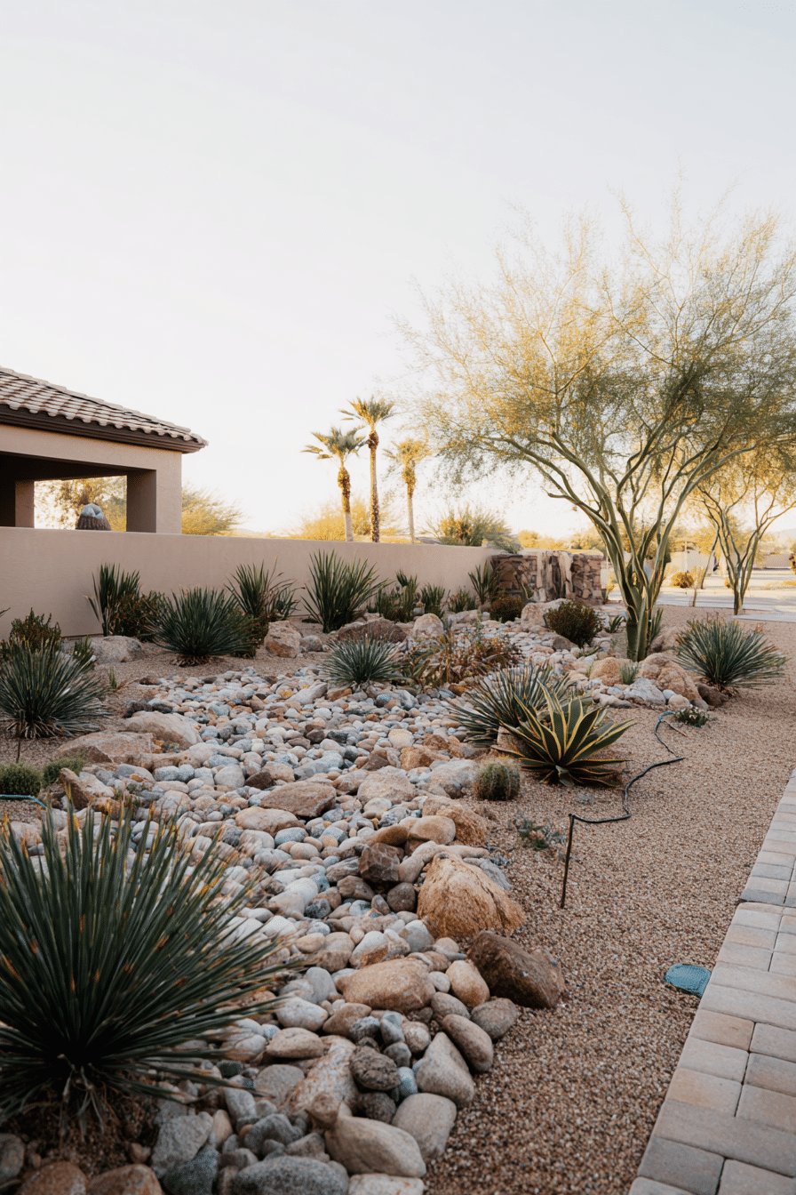 I love how calm and intentional this desert backyard feels. A dry riverbed of smooth stones winds through pea gravel, punctuated by sculptural agaves, spiky yucca and low barrel succulents, while a lacy palo verde tree and a row of palms add vertical drama and soft shade.