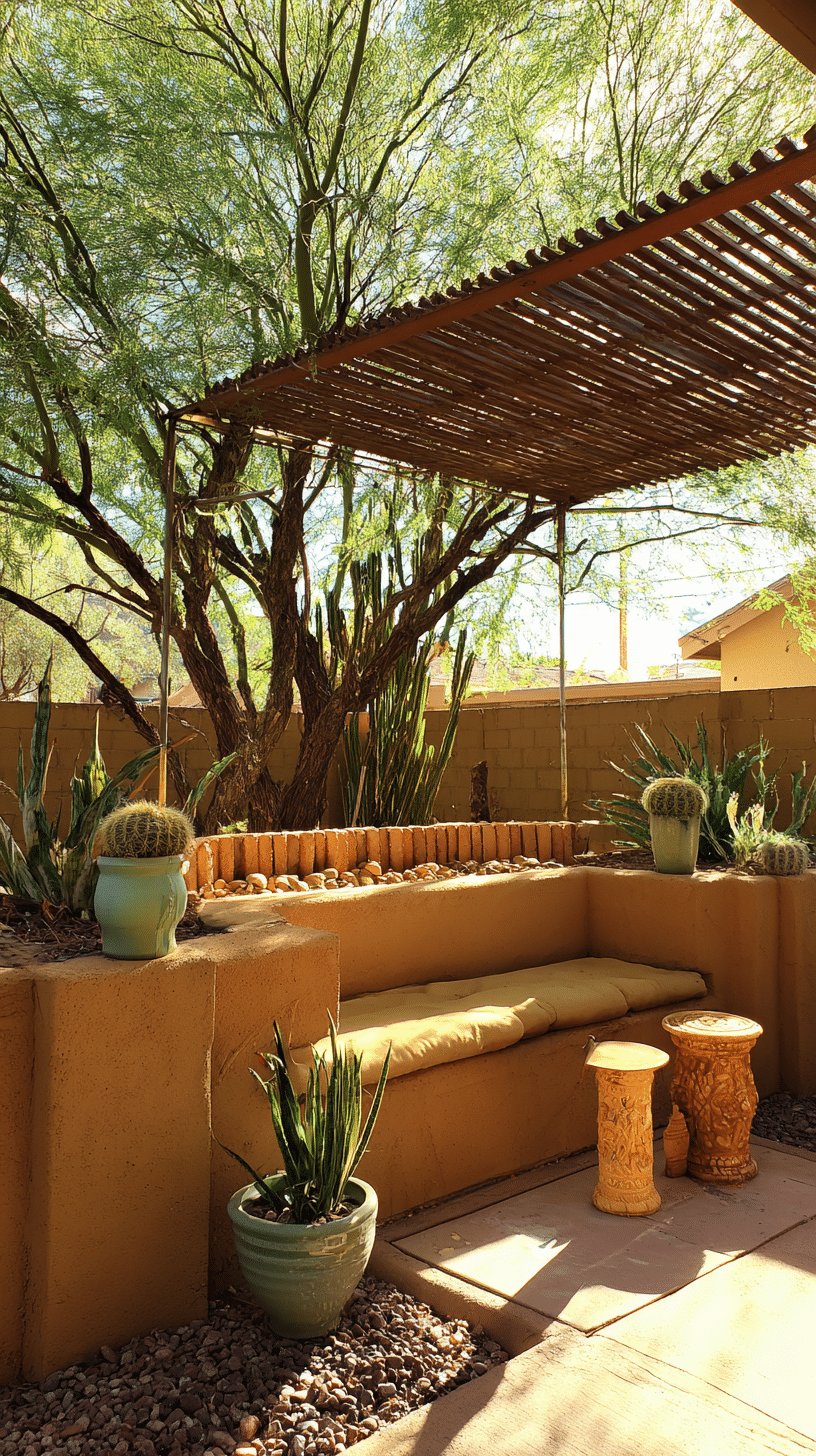 I love the sun-baked calm of this desert backyard. The warm stucco bench and sand-colored pavers feel like they were always meant to be there, while the slatted pergola and mature tree let just enough dappled light through to make the cacti and columnar succulents look dramatic without trying.