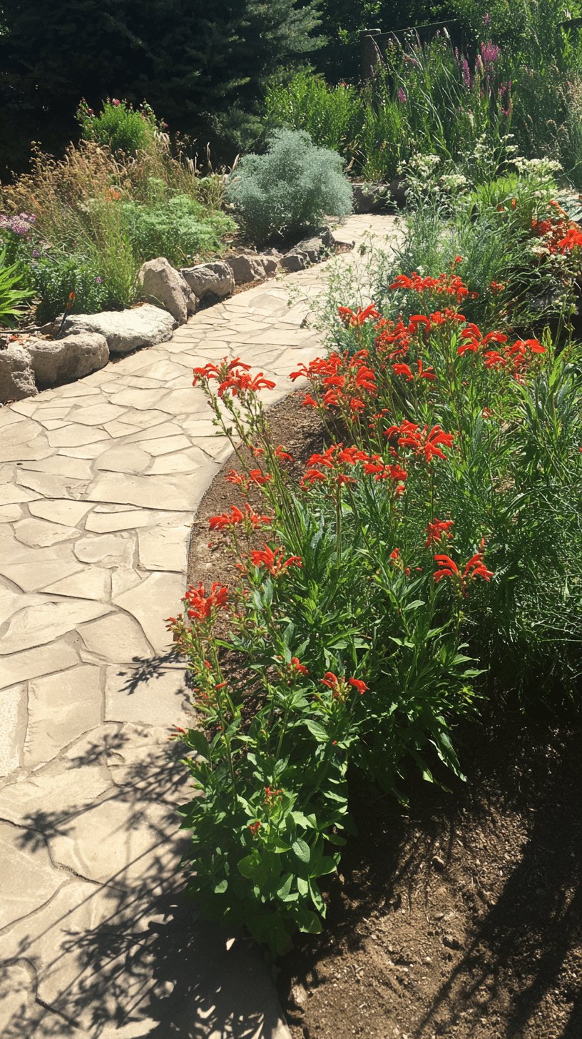 The planting is a masterclass in easy drama — feathery grasses and silvery, soft-leaf shrubs give volume while bold, red tubular blooms punch the whole scene awake.
