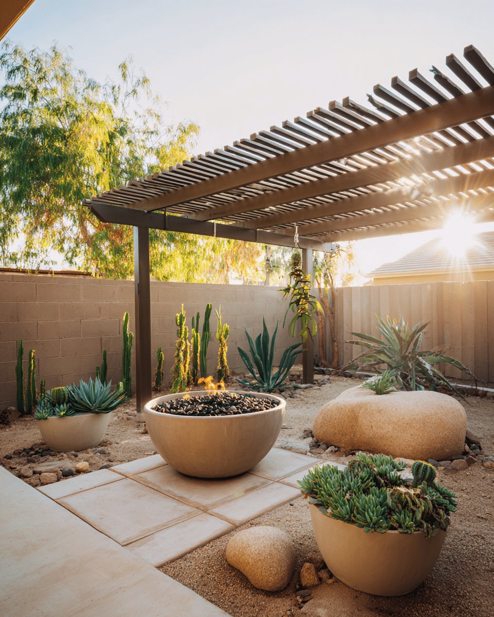 Style it with a few terracotta planters and a low wooden bench to invite lingering. Add lanterns or soft path lights for evening warmth and a metal fire bowl if you want a focal point that doubles as company-magnet. Keep textiles woven and neutral, then drop in one bold agave or a sculptural cactus to give the scene a little drama.