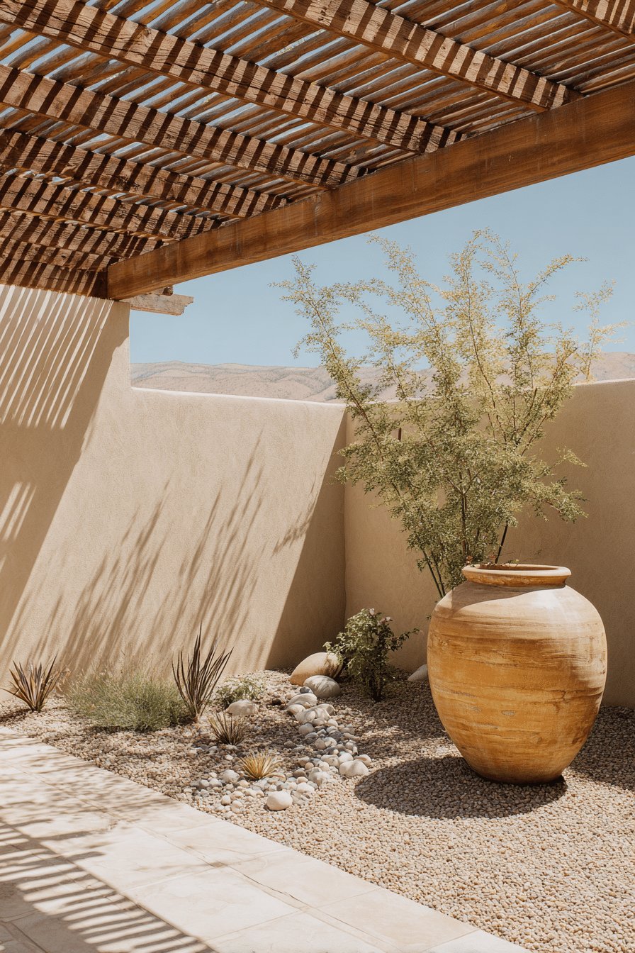 I love the calm, sun-baked simplicity of this desert backyard. The slatted pergola casts graphic shadows on warm stucco walls, while gravel and river rock create texture and a dry stream that leads the eye to a big terracotta urn and a scattering of drought-tolerant plants like spiky agave, soft grasses, and a feathery desert tree.