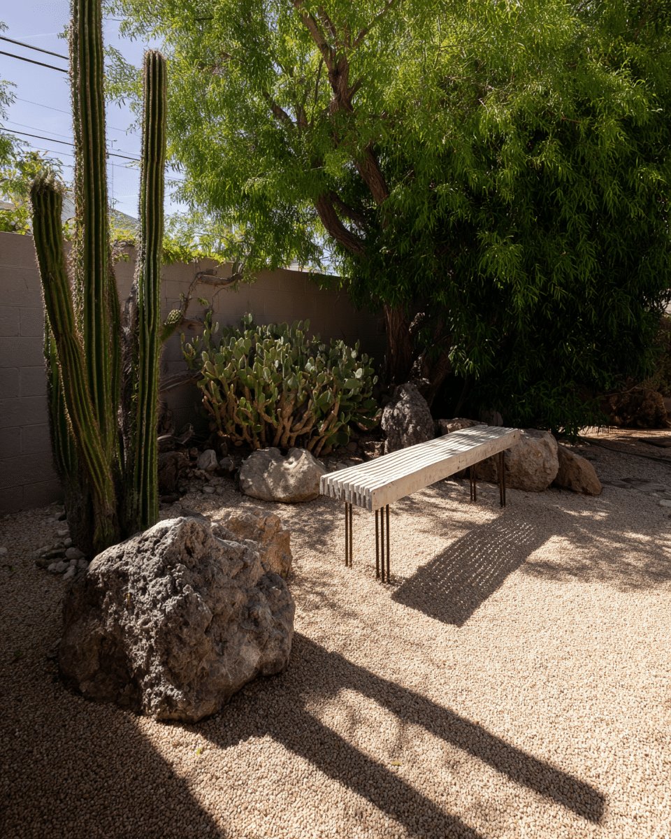 A squat prickly pear and a big shady tree add soft contrast, while the skinny-legged slatted bench casts that delicious striped shadow that makes me want to sit with a cold drink and zero agenda. It reads modern but warm, low-maintenance but not boring.