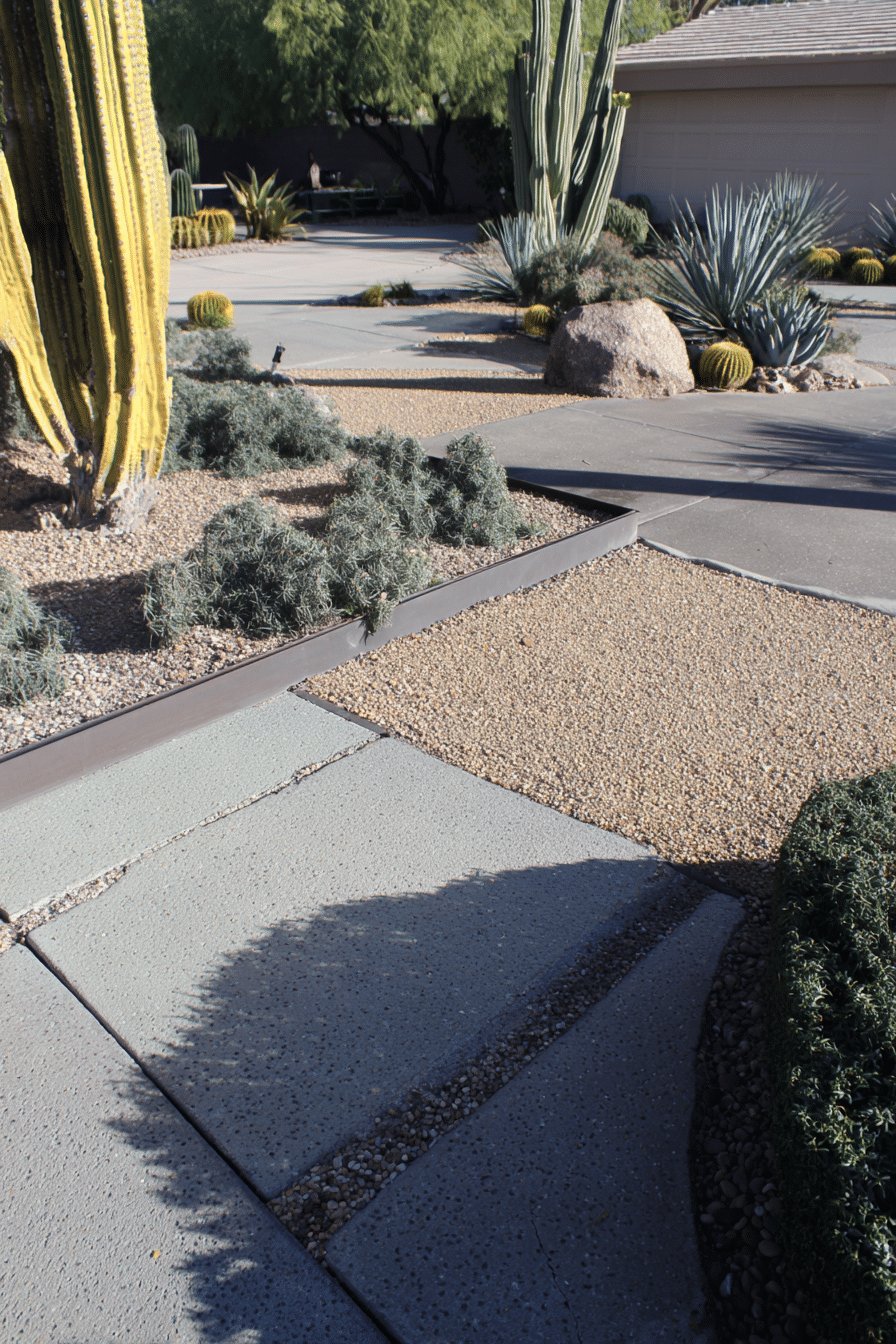I love the calm, sculptural mood of this desert backyard. Broad concrete pavers set against warm gravel create clean, modern lines while metal edging and a few boulders add structure without fuss.