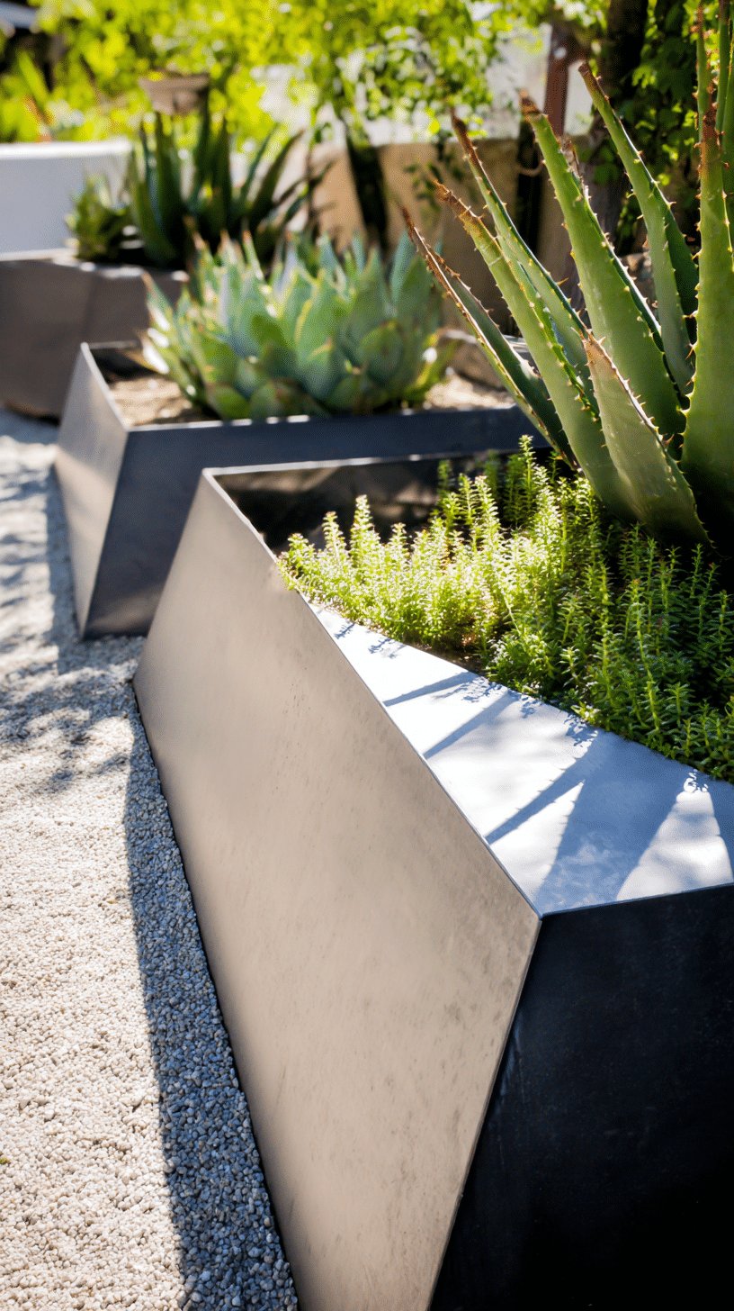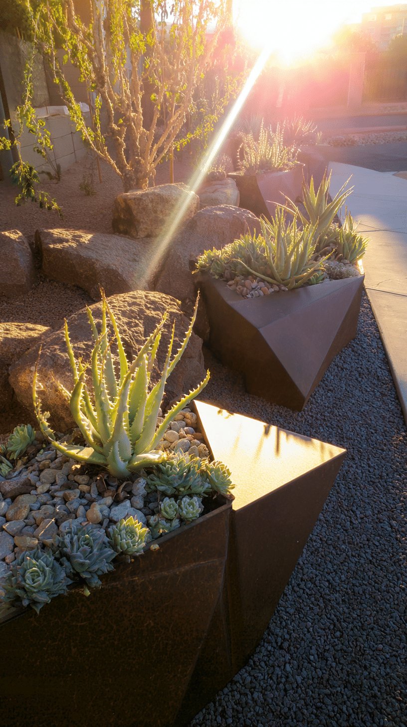 I love the calm, graphic energy of those angular metal planters set against pale gravel. Sculptural agave and tight, mat-forming succulents sit like tiny desert sculptures, and the clean edges feel modern without trying too hard.