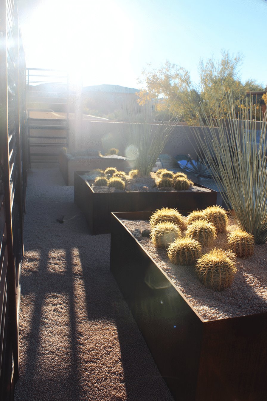 I love the warm, sculptural vibe of this desert backyard. Rusted geometric planters sit like little sculptures filled with agave, aloe, and tight rosettes of succulents, while big boulders and a carpet of pea gravel keep the whole thing feeling sun-baked and calm.