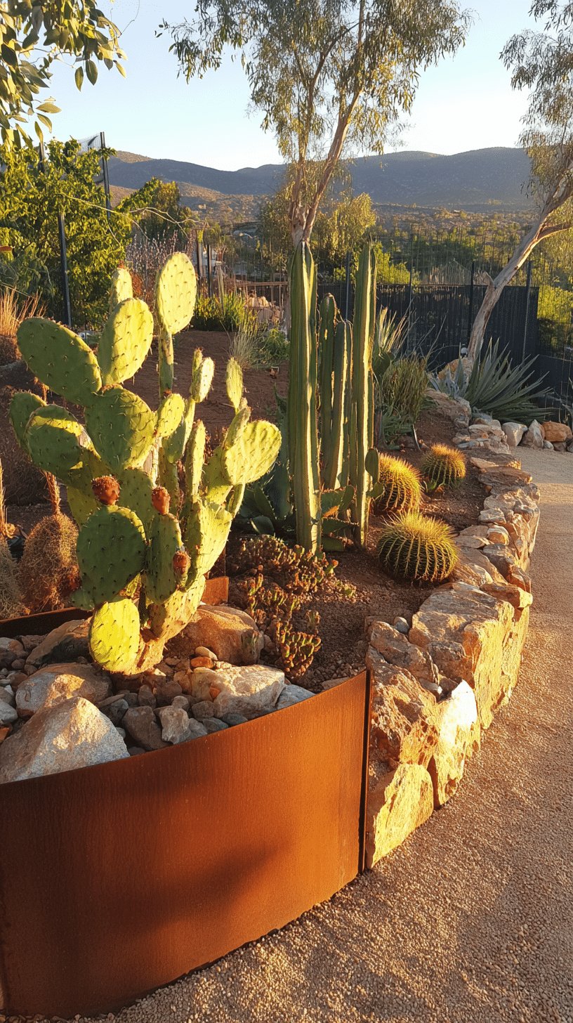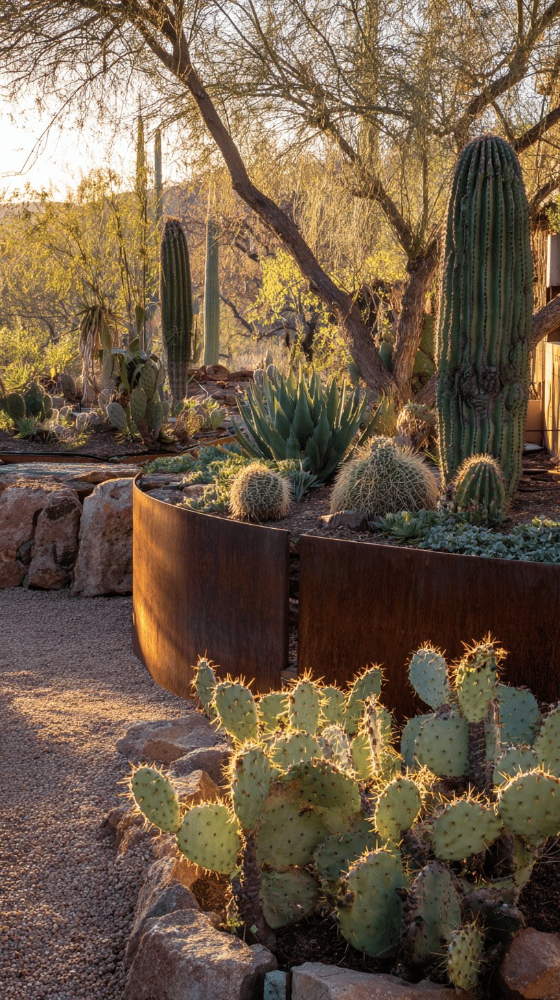 Add a rusted trough or a sculptural pot for a focal point, and keep planting clusters layered and sparse for that natural desert look. Trust the textures and give it room to breathe — perfection is overrated and this scene looks better a little lived-in.