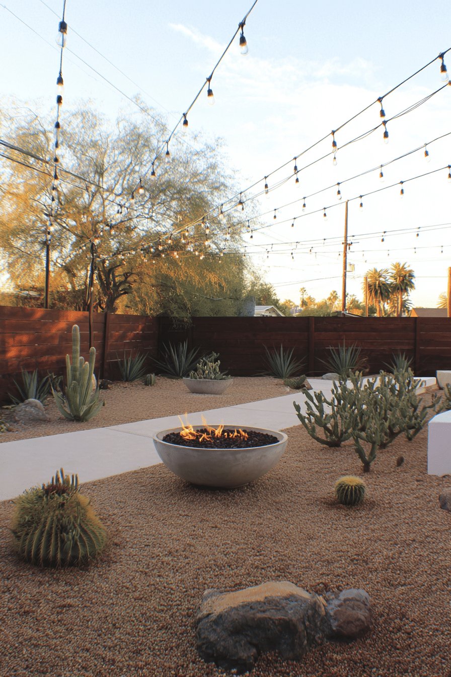 A round concrete fire bowl becomes a cozy focal point, surrounded by sculptural succulents and cacti, like barrel cactus, columnar pieces, and low agave-style plants that read like modern desert art.