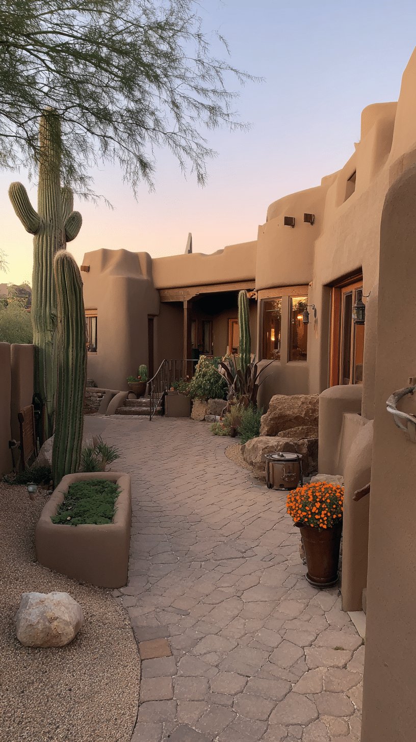 I adore the warm, sun-baked mood of this desert backyard. The soft adobe walls and textured paver path feel grounded and relaxed, while the tall saguaro and clusters of succulents add sculptural drama without fuss.
