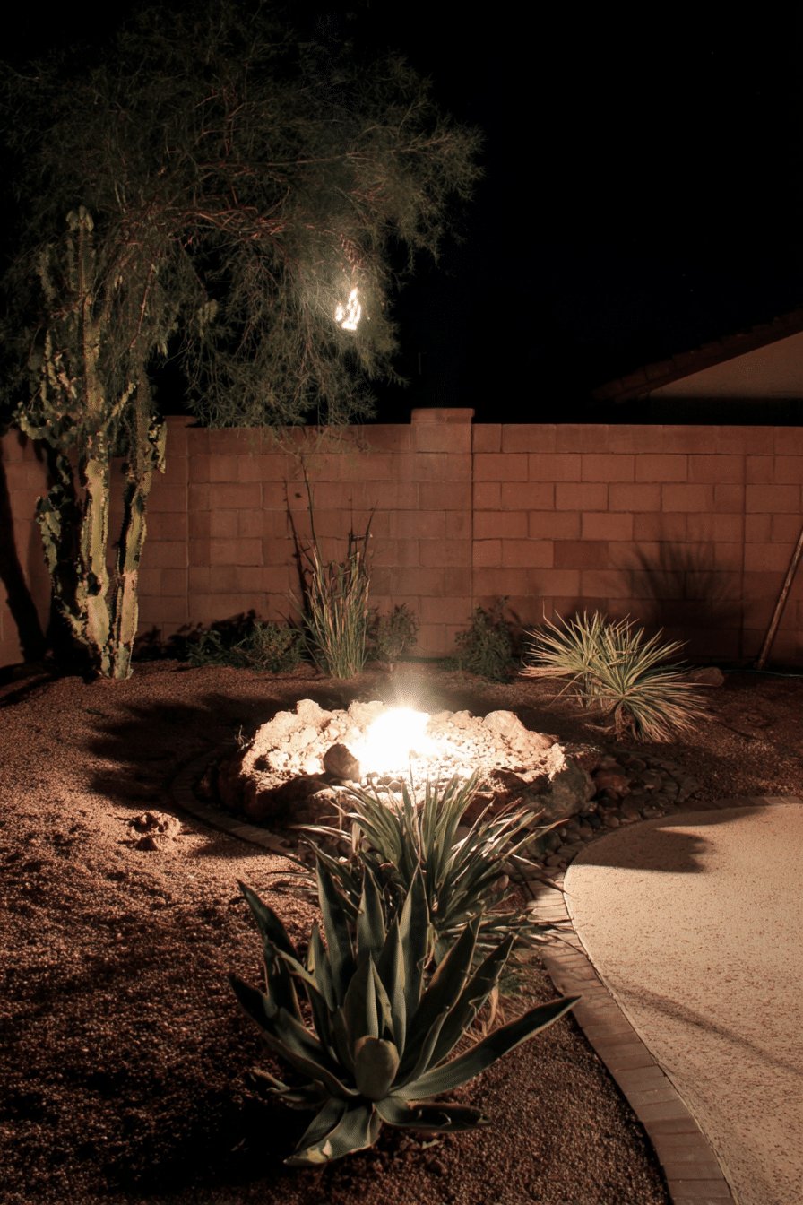 I love the calm, desert-night vibe here. A low, glowing rock feature becomes the stage, while gravel, brick-edged curves, and a sweep of agave and spiky yucca keep the look clean and textural.