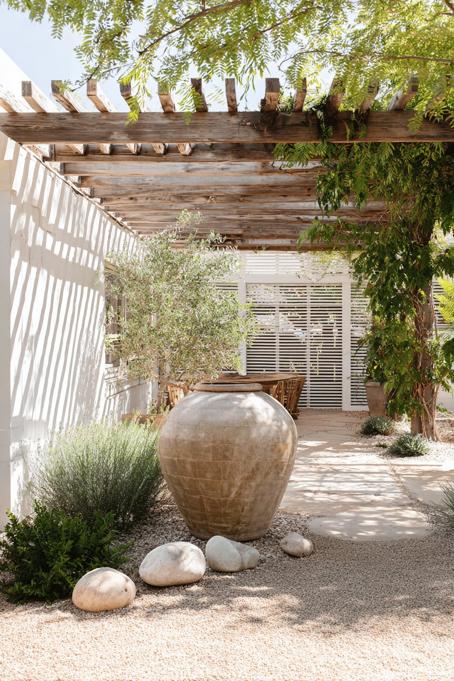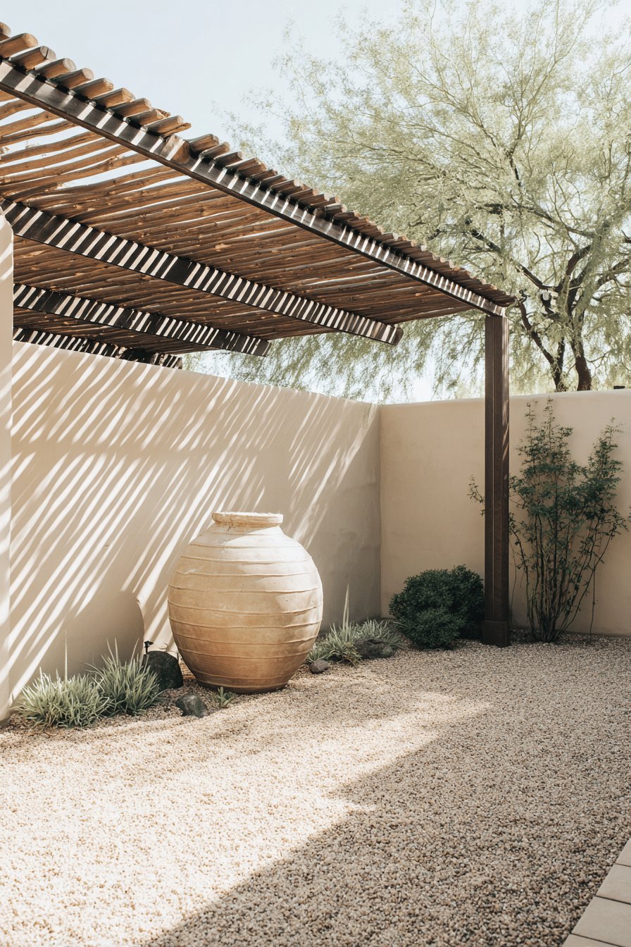 I love the sun-baked calm of this desert backyard. The weathered pergola casts playful stripes of shade, the gravel and flagstone path feels low fuss, and that oversized terracotta urn steals the show without trying too hard.
