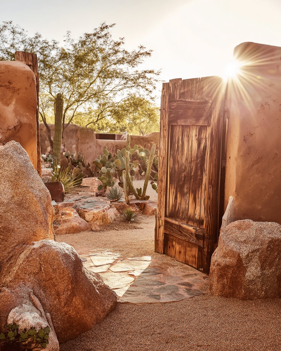 I love how this backyard reads like a desert postcard — warm adobe walls, a weathered wooden gate that begs to be pushed open, and a mix of flagstone and fine gravel that feels both intentional and effortless.