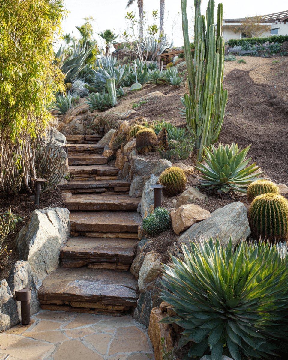 I love the layered, sculptural feel of the slope with flagstone steps framed by rough boulders and a crowd of spiky succulents. Golden barrel cacti, agave rosettes and a tall columnar cactus add vertical drama while gravel and mulch keep chores to a minimum.