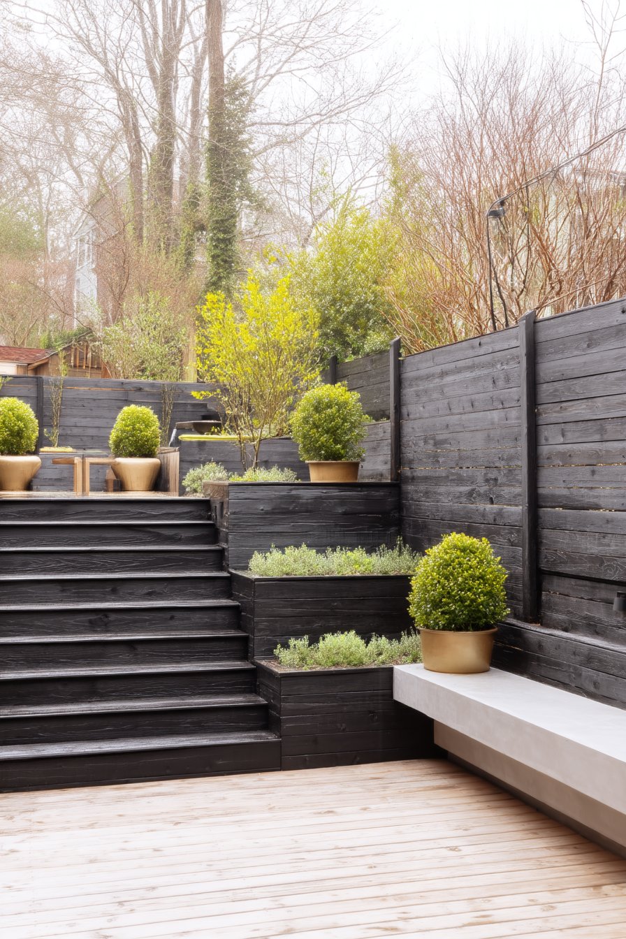 This modern tiered garden beautifully combines structured boxwoods with soft, fragrant herbs like lavender, creating a striking contrast in colors and textures. To replicate this look, consider using dark wood materials for planters and pathways, and incorporate low-maintenance plants for a chic yet effortless aesthetic.