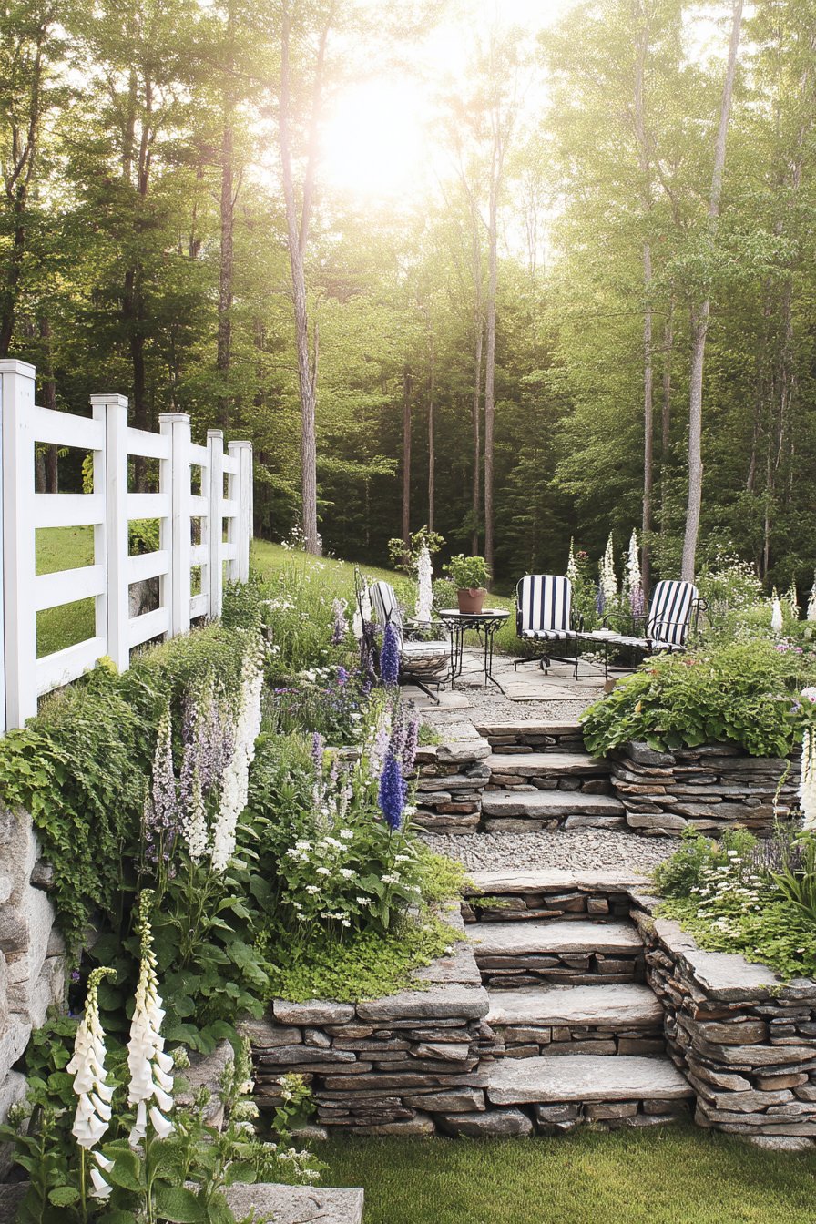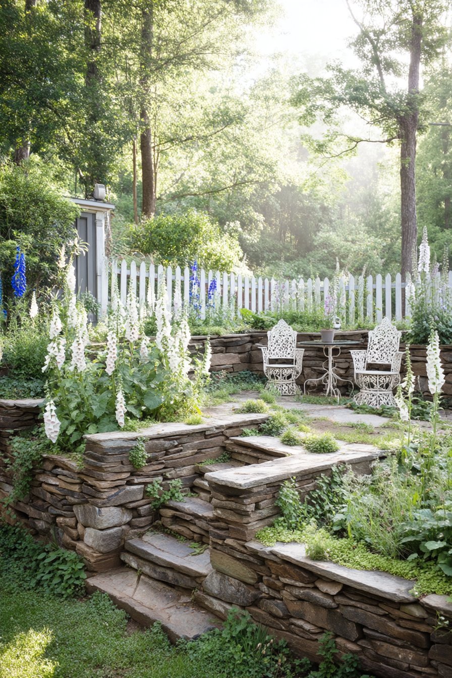 The tiered stone structure beautifully showcases tall, elegant foxgloves, creating a stunning vertical display that draws the eye upward. Incorporate rustic stone elements and a cozy seating area with intricate metal furniture to achieve a charming, inviting atmosphere.