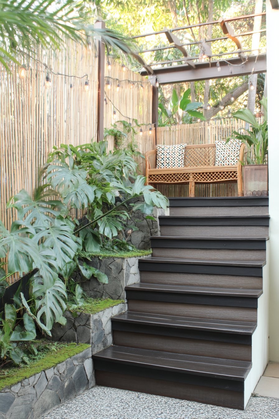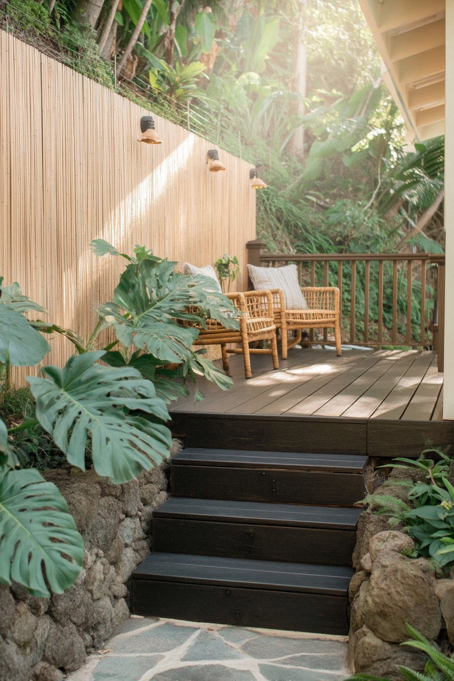 The harmonious blend of lush tropical plants, like monstera and ferns, creates a serene retreat accentuated by warm wood tones and natural stone. To replicate this look, incorporate layered greenery and cozy seating, enhancing the space with ambient lighting for a magical evening atmosphere.
