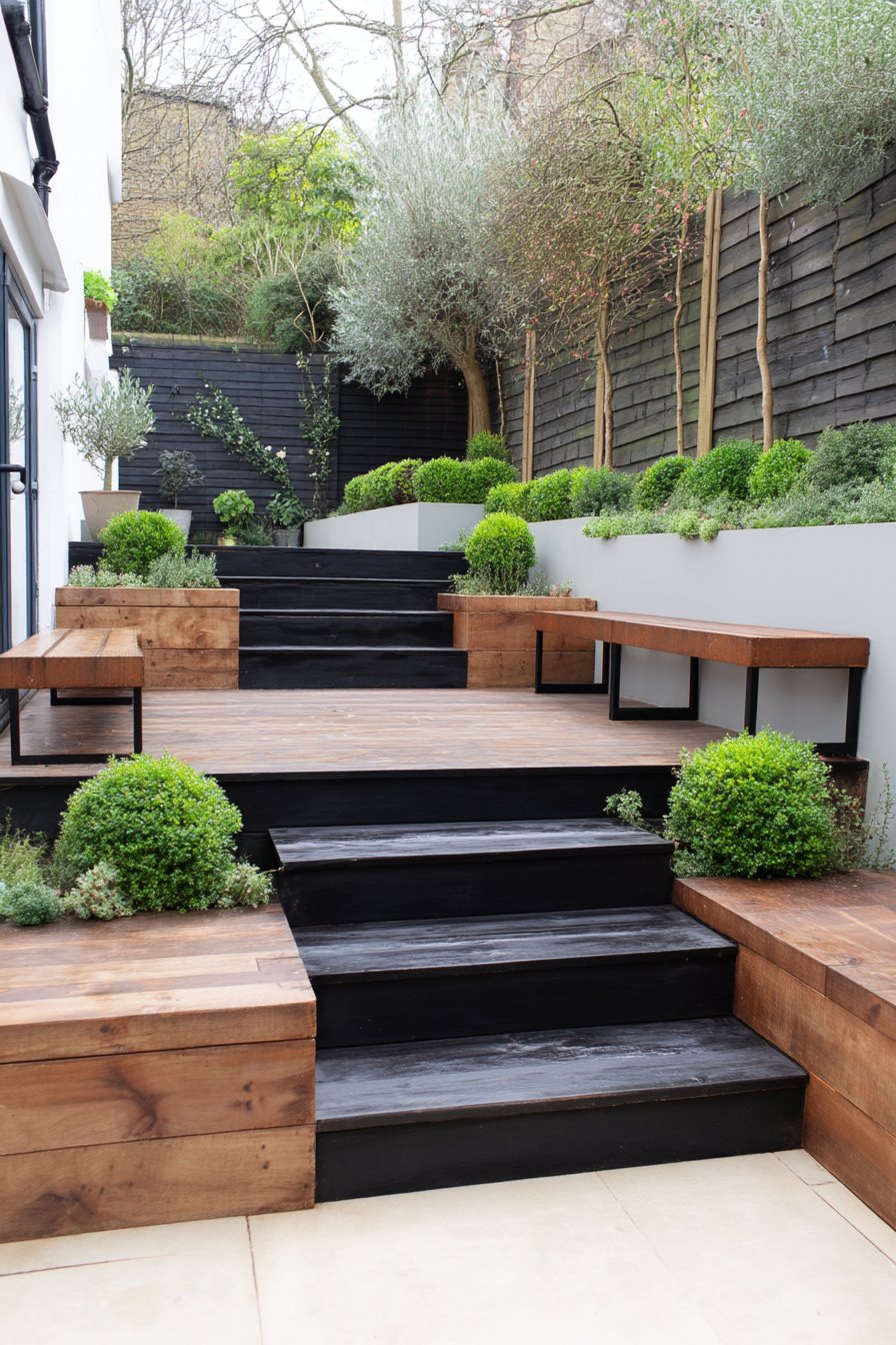 This modern garden features sleek black steps and lush boxwood hedges, creating a striking contrast that enhances the contemporary aesthetic. For a similar look, incorporate multi-level plantings and use durable materials like wood and stone for seating and pathways.
