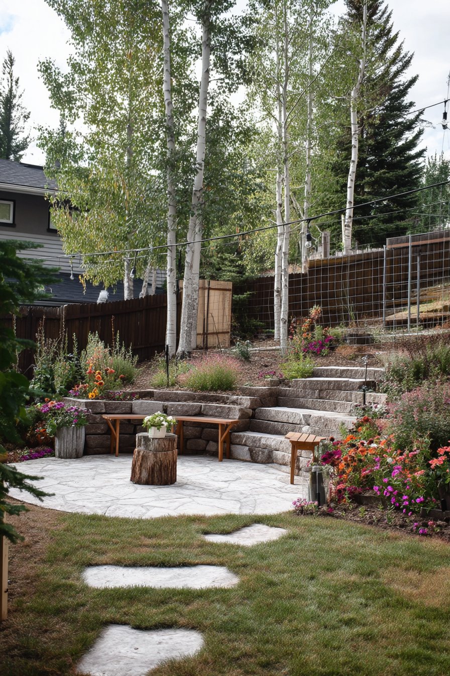 The tiered design beautifully incorporates vibrant blooms like petunias and marigolds, creating a stunning visual contrast against the natural stone steps. To replicate this look, consider using native plants alongside decorative elements like rustic seating and natural wood accents for a cohesive feel.