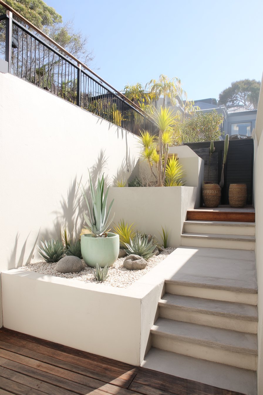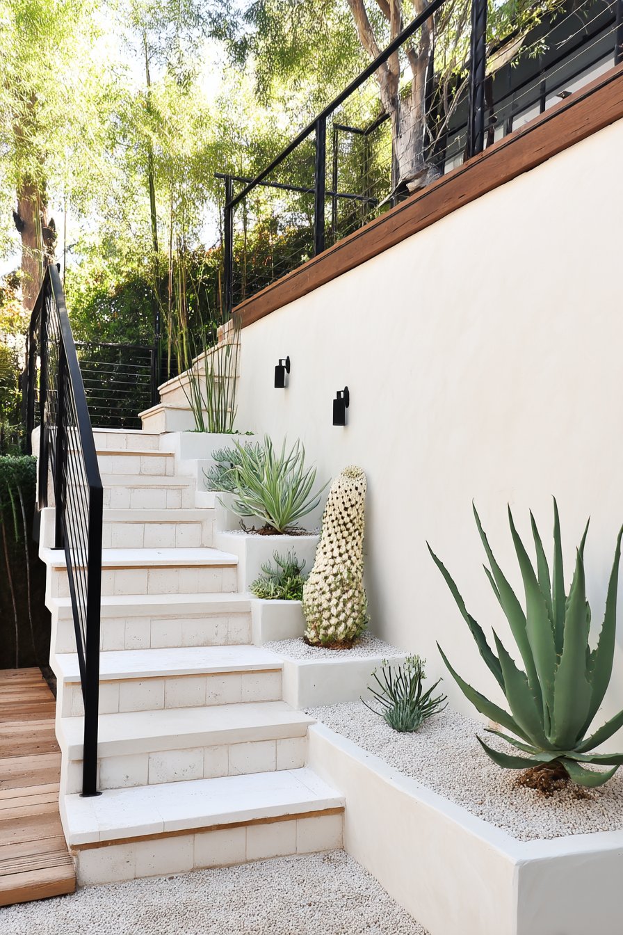 The sleek white staircase, adorned with vibrant succulents like agave and cacti, creates a stunning contrast against the minimalist backdrop. Incorporating gravel and strategic lighting enhances the serene ambiance, perfect for achieving a modern oasis at home.