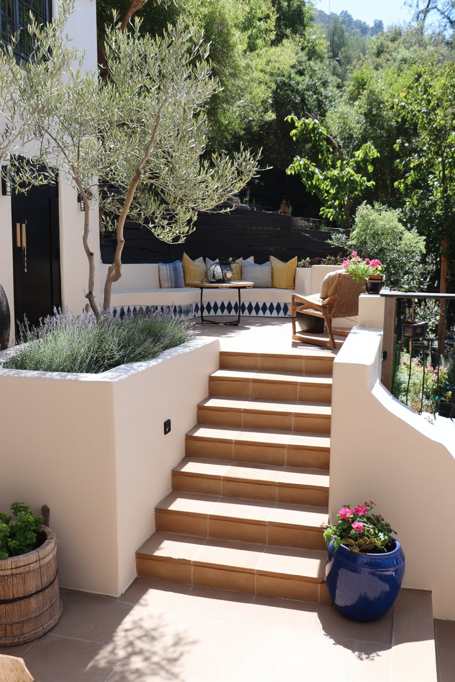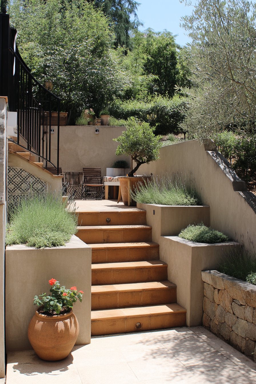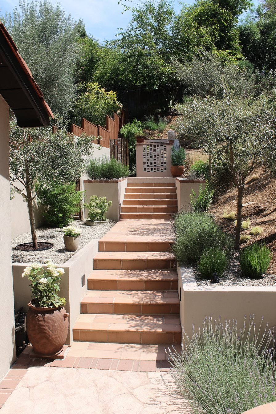 The warm terracotta steps beautifully contrast with lush herbs like lavender and thyme, creating a fragrant ascent that invites exploration. Incorporate rustic pots and a mix of ornamental plants to enhance the Mediterranean charm in your own garden.
