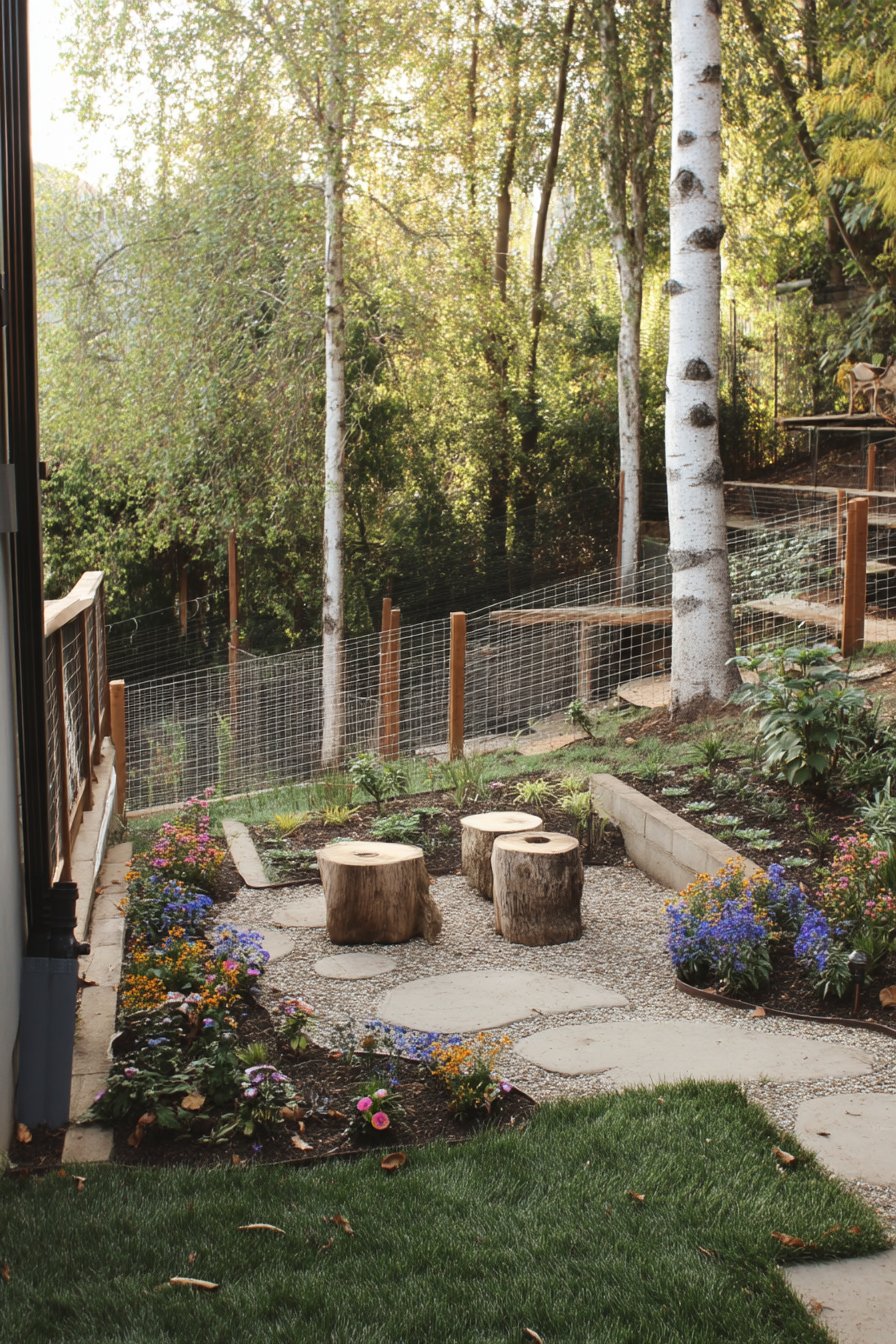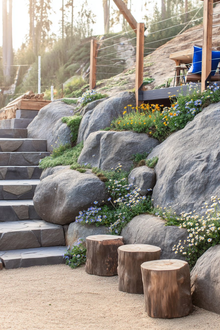 This hillside garden beautifully blends rugged stones with vibrant wildflowers like California poppies and forget-me-nots, creating a natural yet inviting aesthetic. To replicate this look, incorporate native plants that thrive in rocky conditions and use natural materials like wood for seating to enhance the organic feel.