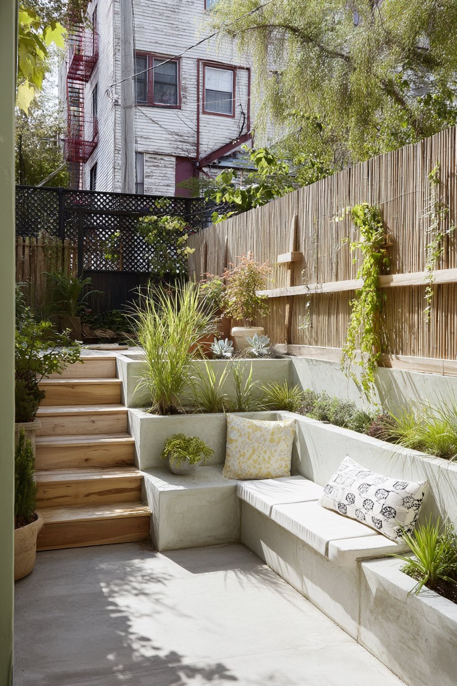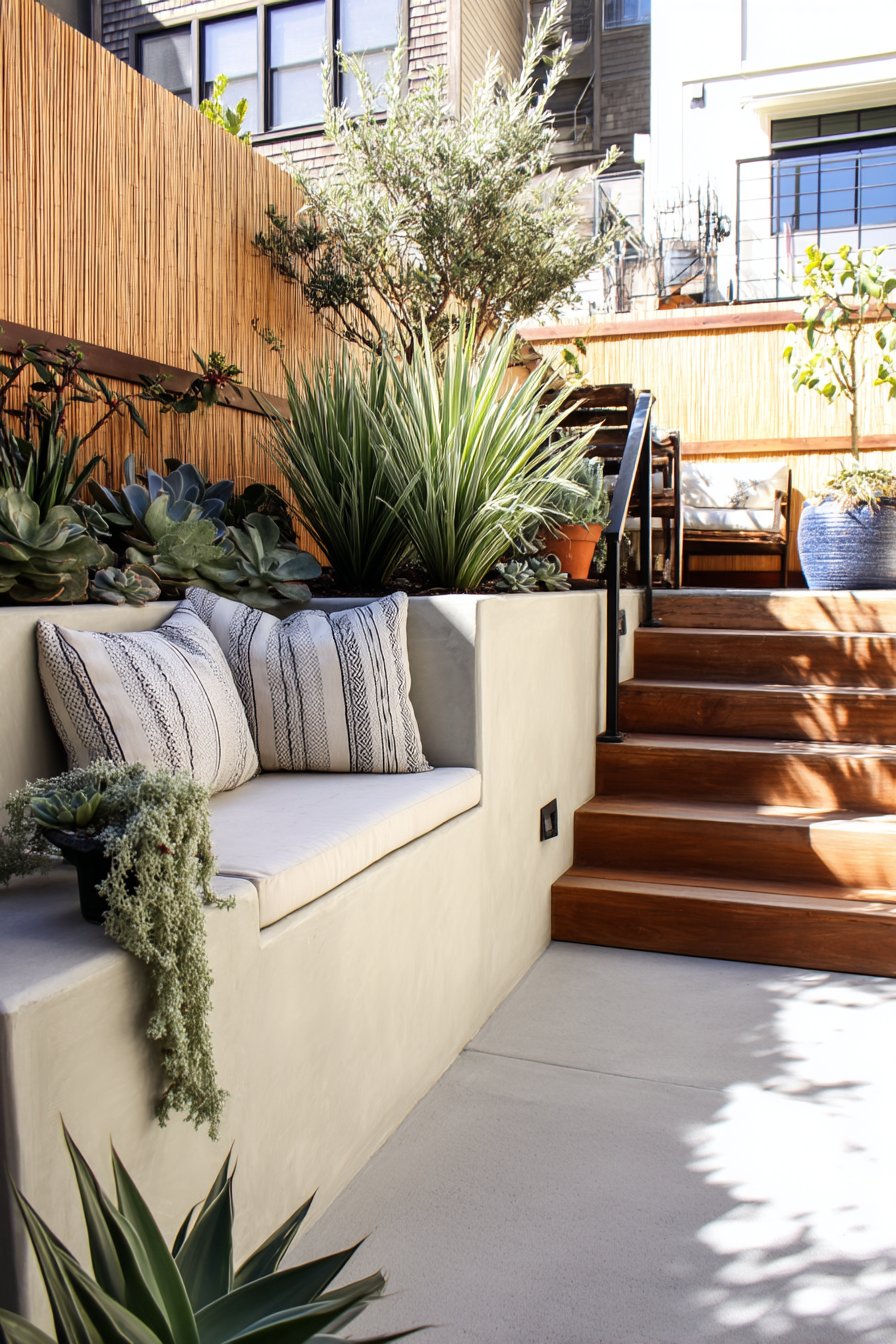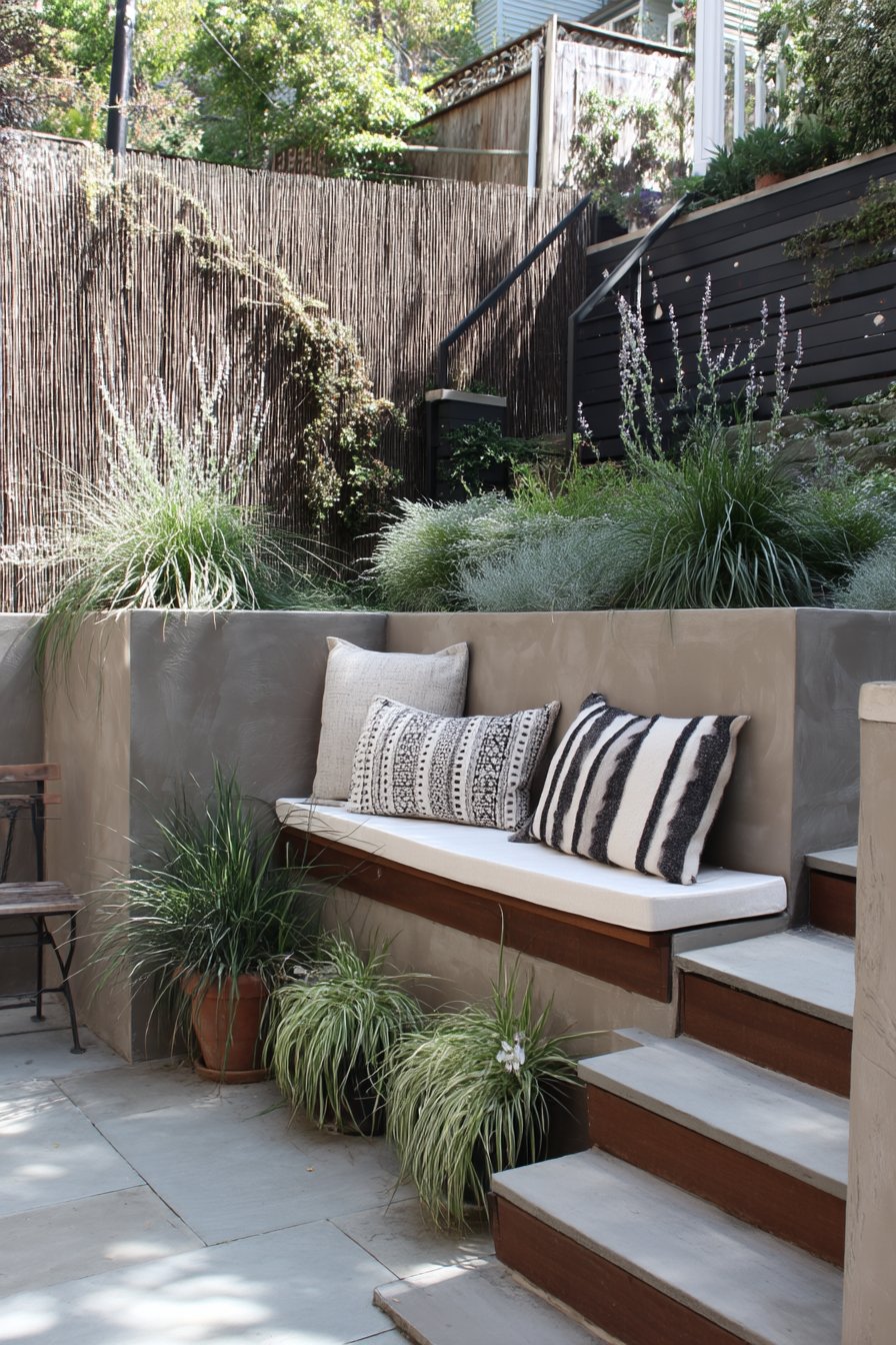 This modern tiered garden features a harmonious blend of succulents and ornamental grasses, creating a serene retreat that invites relaxation. Incorporate concrete planters and cozy seating with decorative pillows to achieve a similar inviting atmosphere at home.