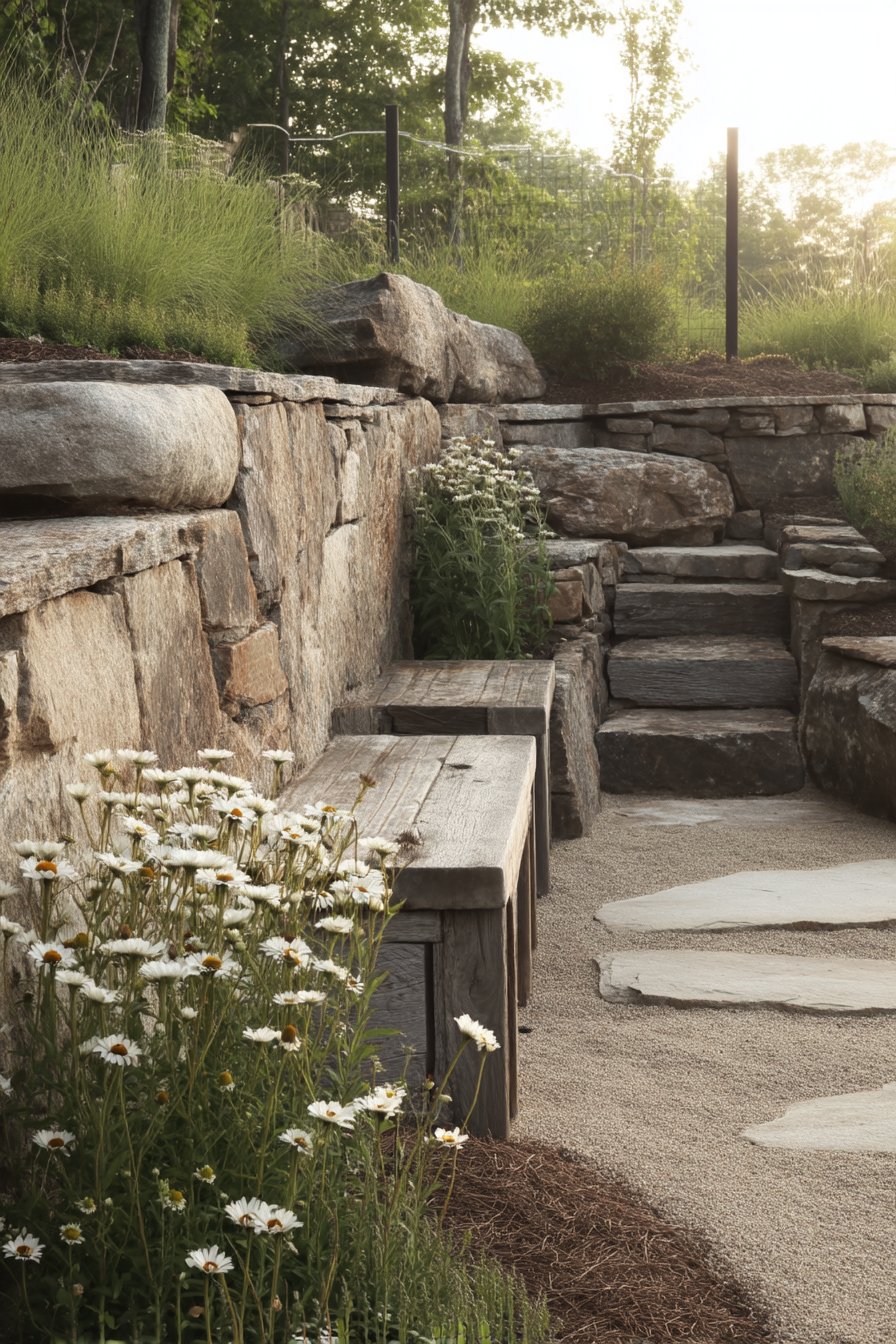 25) Rustic Stone Terrace with Daisies