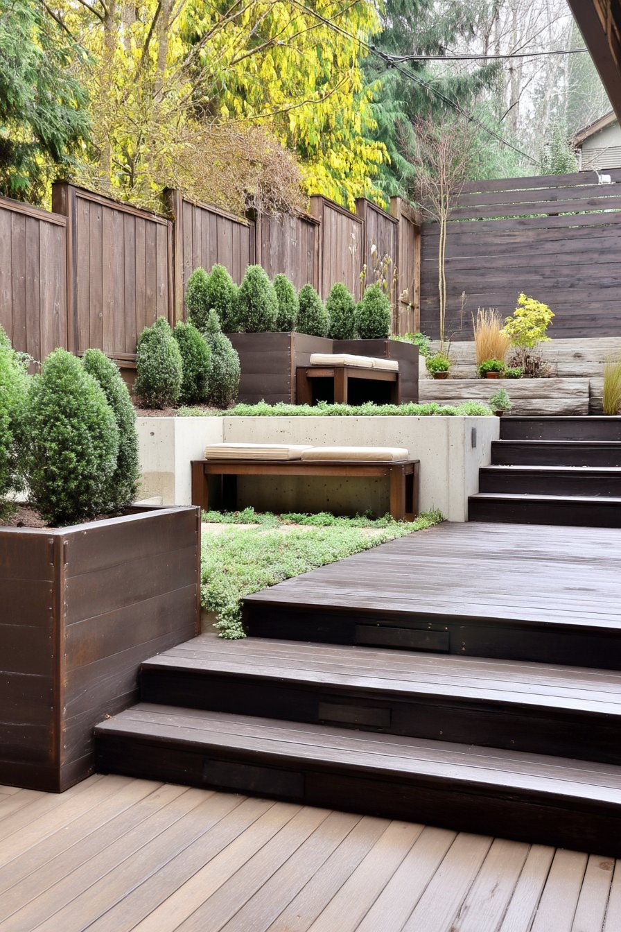 23) Modern Tiered Garden with Evergreens