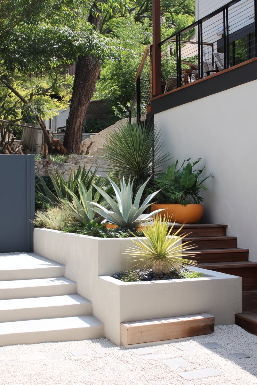 The striking combination of agave, yucca, and vibrant orange planters creates a contemporary yet inviting atmosphere, perfect for a modern garden. To replicate this look, incorporate varied textures and colors while utilizing steps for visual interest and accessibility.