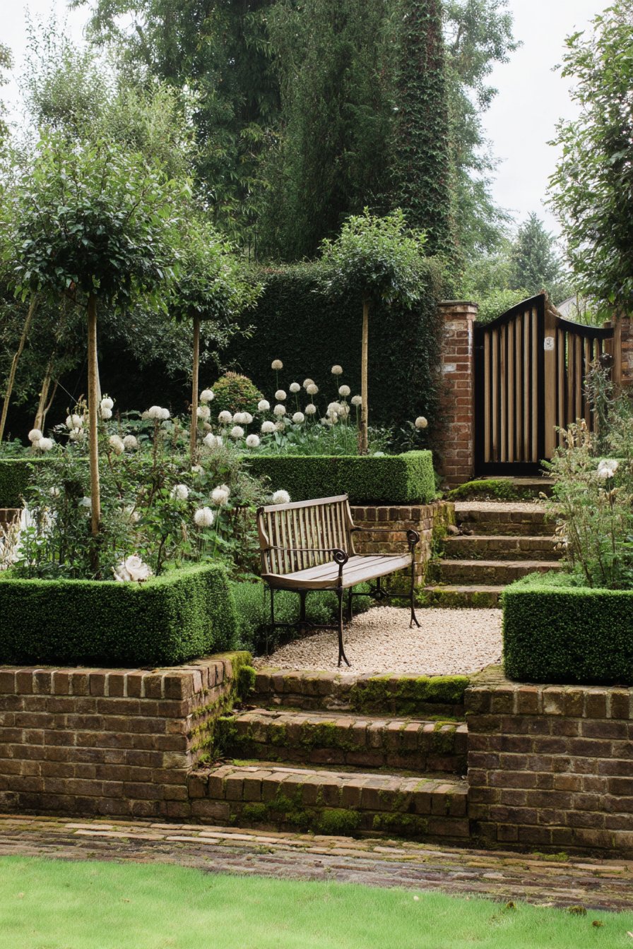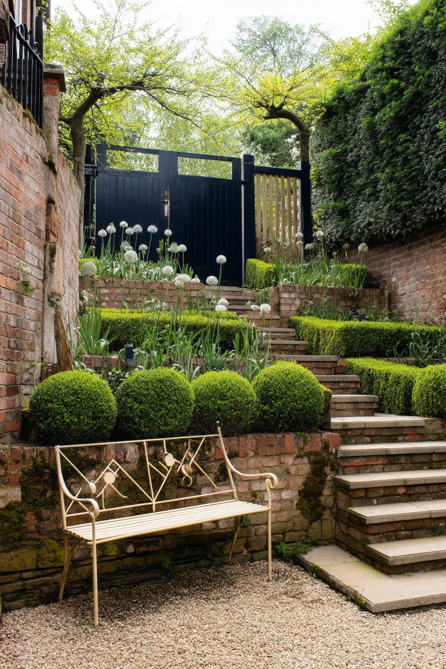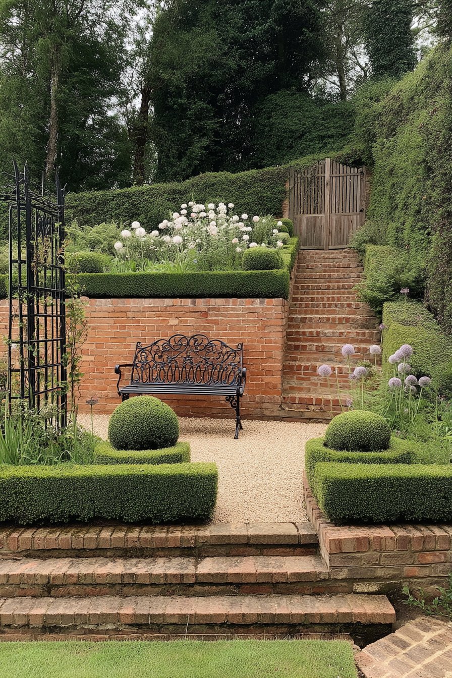 This tiered garden features elegant allium blooms, creating a stunning focal point against the lush greenery and structured hedges. To replicate this look, combine low-maintenance boxwood hedges with seasonal flowering plants, and include a cozy seating area for relaxation.