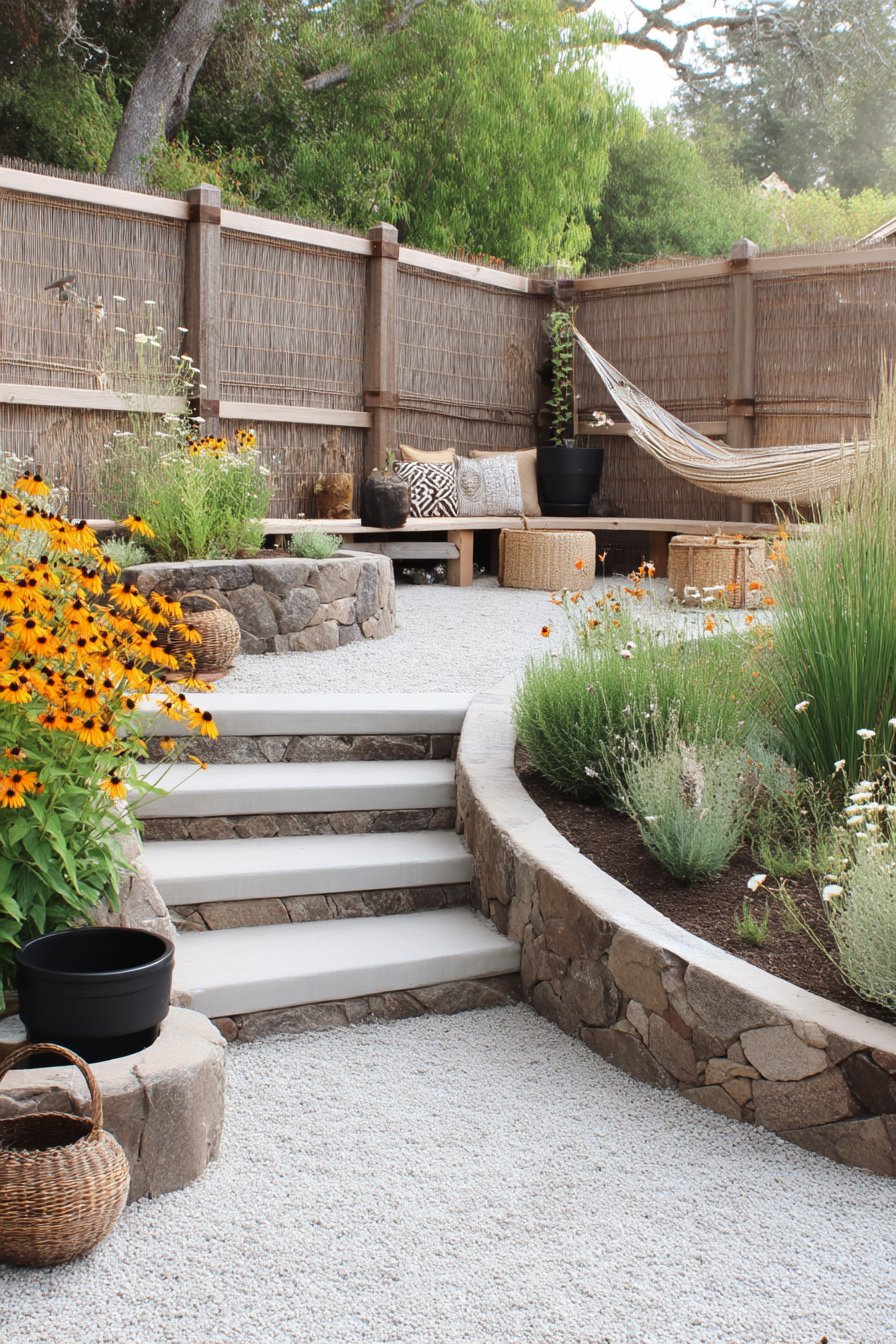 This design beautifully combines vibrant black-eyed Susans and soft lavender, creating a lively yet serene atmosphere perfect for relaxation. To replicate this look, incorporate layered stone elements and cozy seating areas surrounded by a mix of perennials and ornamental grasses.