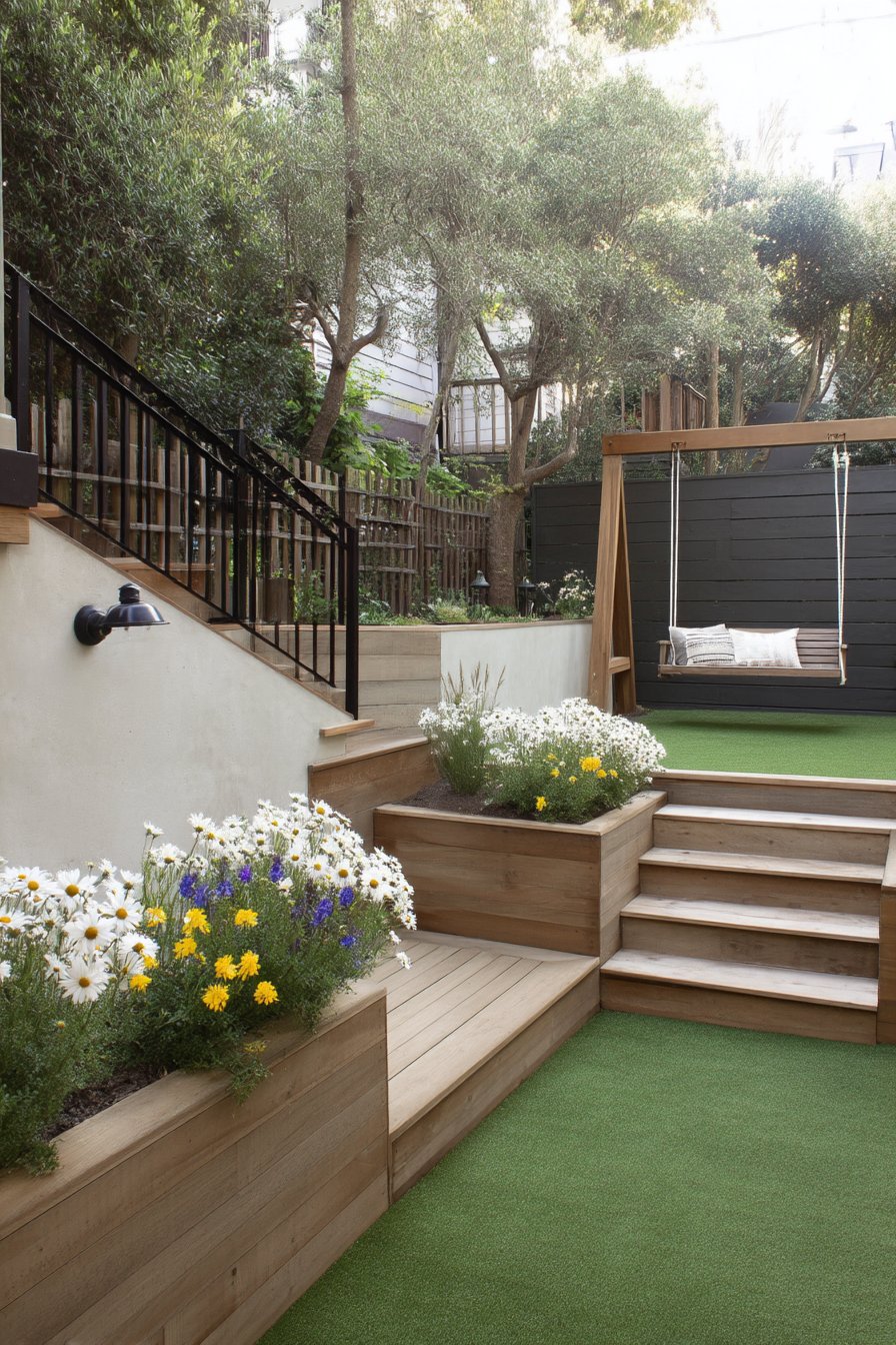 This modern tiered garden features vibrant daisies and cheerful marigolds, creating a lively contrast against the natural wood planters. To replicate this look, incorporate layered planting with a mix of perennials and annuals for continuous color and texture.
