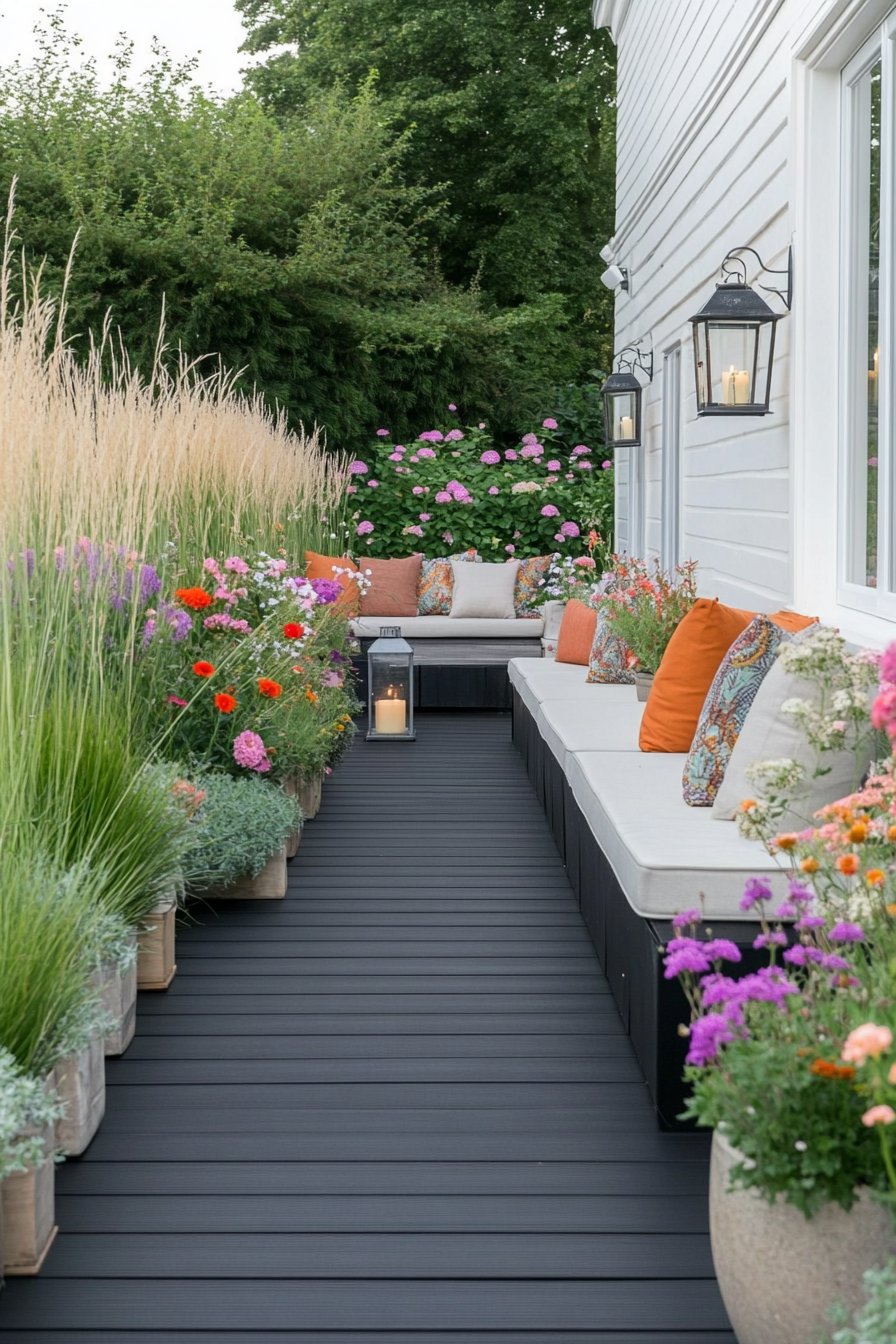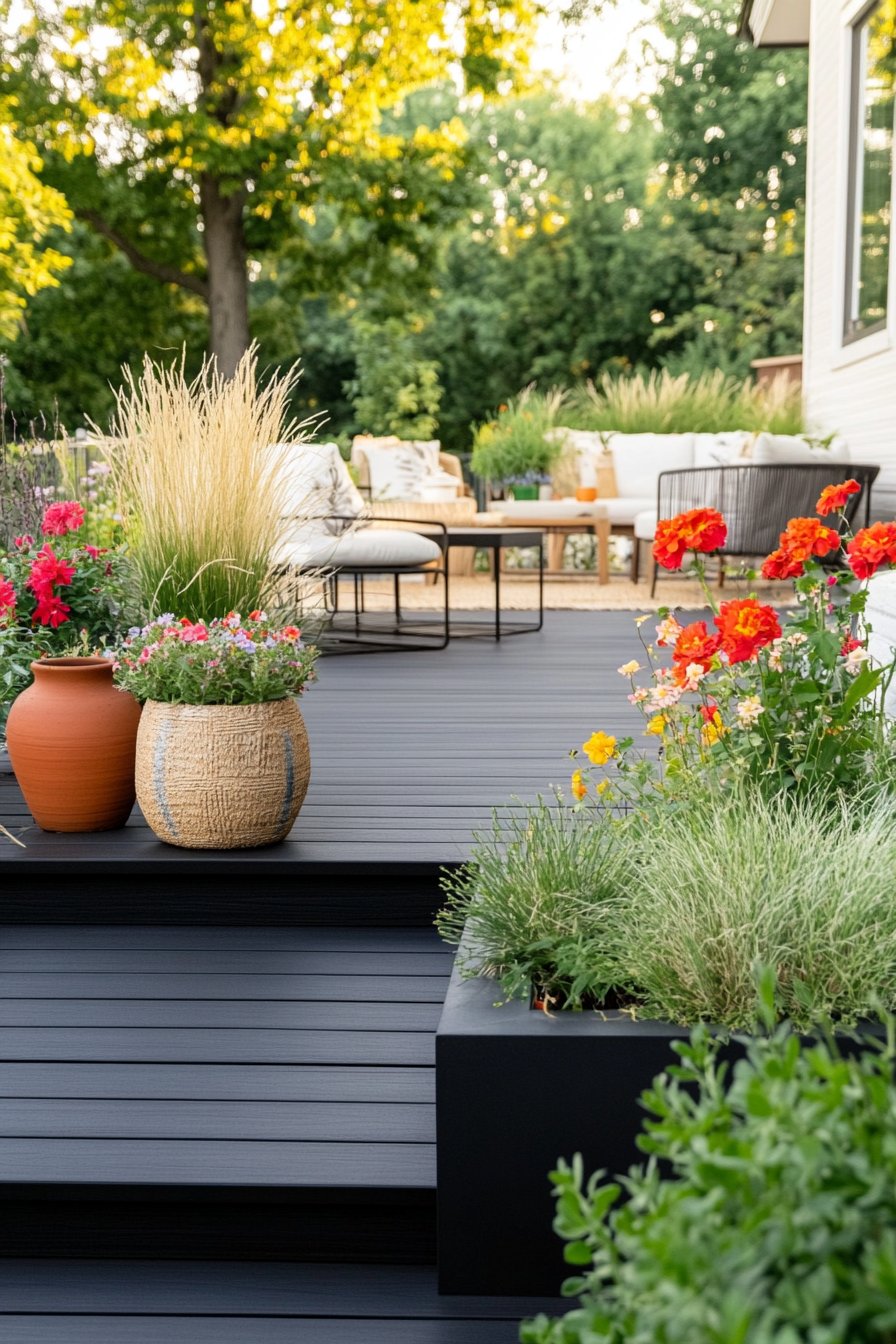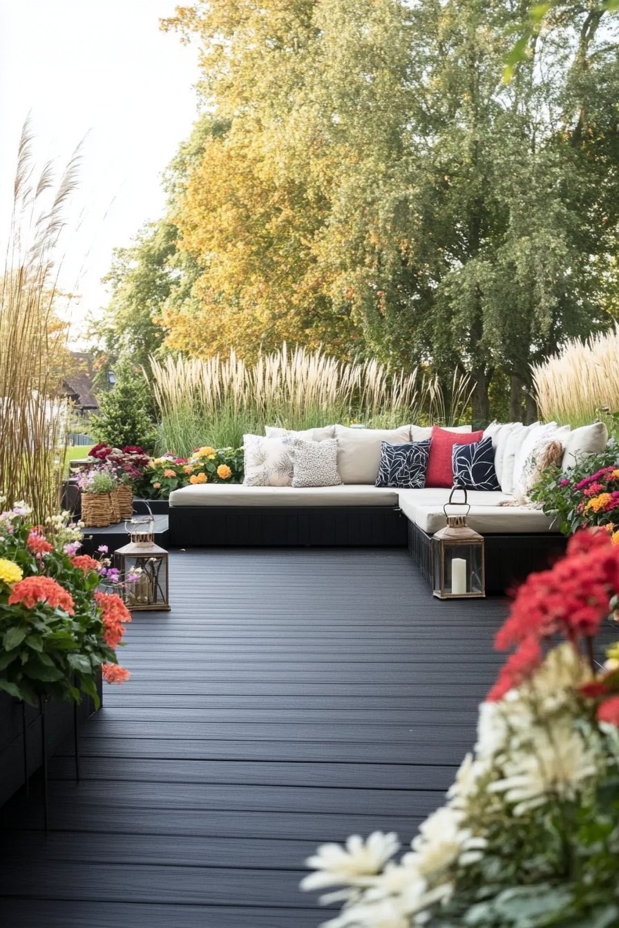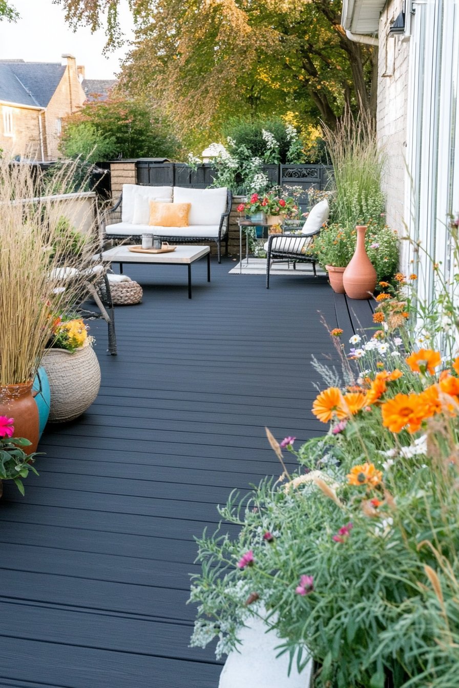 I absolutely adore the way this garden blends contemporary aesthetics with vibrant floral life, creating a serene relaxation space. The striking contrast of the deep black decking with colorful blooms like marigolds and petunias, alongside lush grasses and elegant planters, makes it a captivating retreat that invites you to unwind.