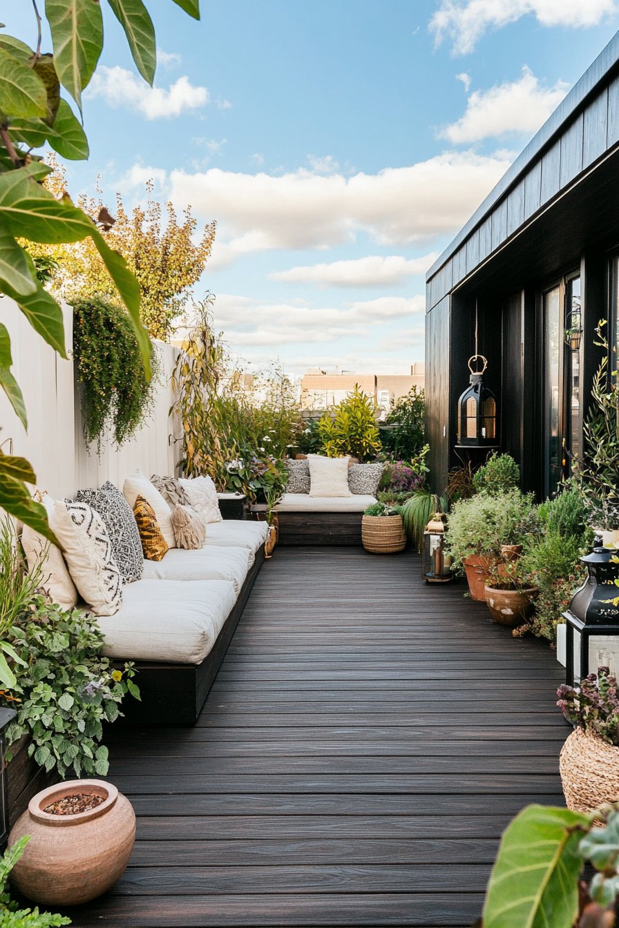 To replicate this cozy atmosphere at home, consider using a dark decking material paired with soft, oversized cushions in light colors for contrast. Incorporating warm-toned lanterns adds a touch of elegance, while strategically placed greenery can enhance privacy and create a serene sanctuary perfect for relaxation.