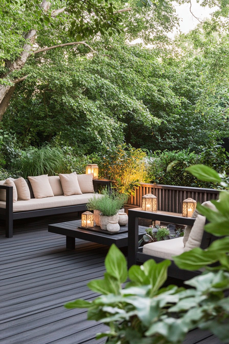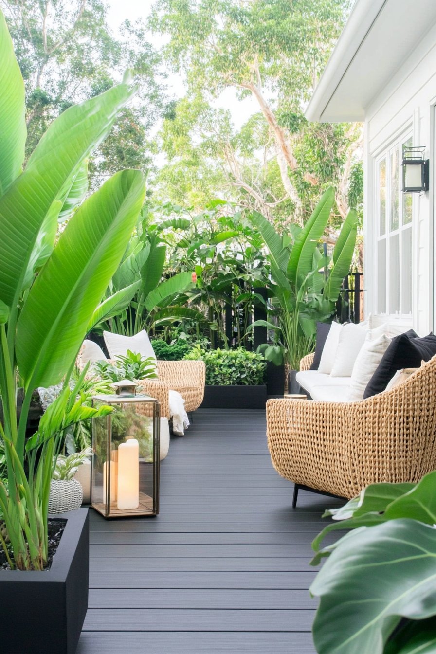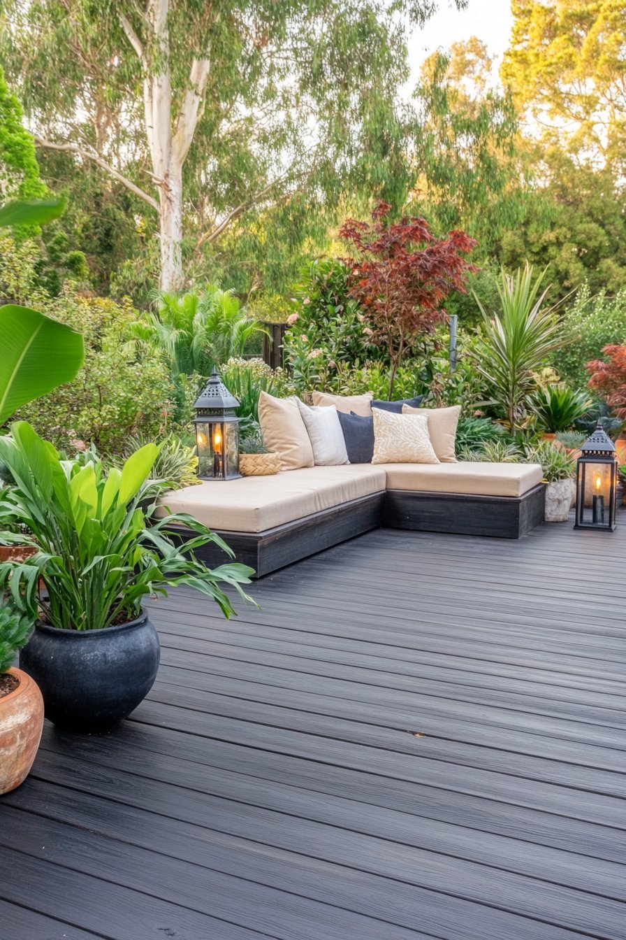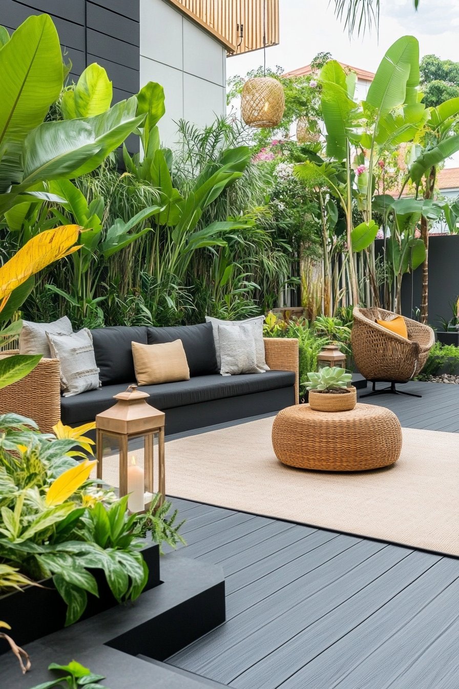 I absolutely adore this design, where the lush greenery of banana plants and ferns creates a vibrant contrast against the sleek, dark decking. The cozy seating area, adorned with plush cushions in neutral tones, invites relaxation, while the warm glow from lanterns adds an enchanting ambiance, perfect for evening gatherings.