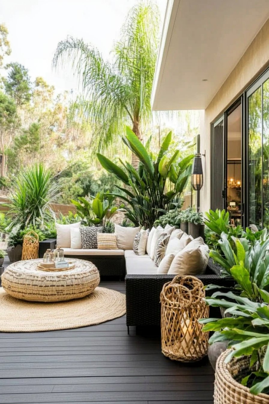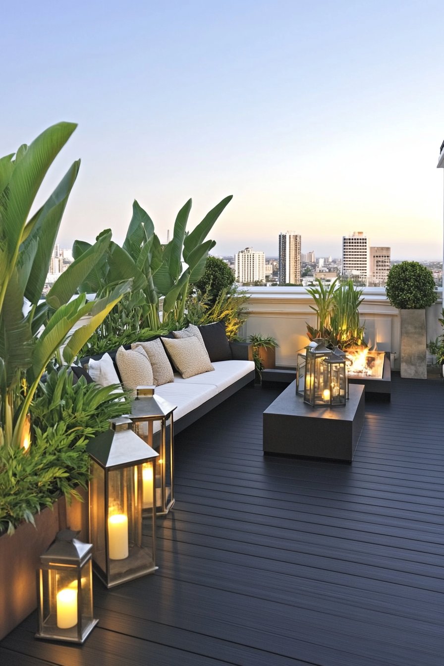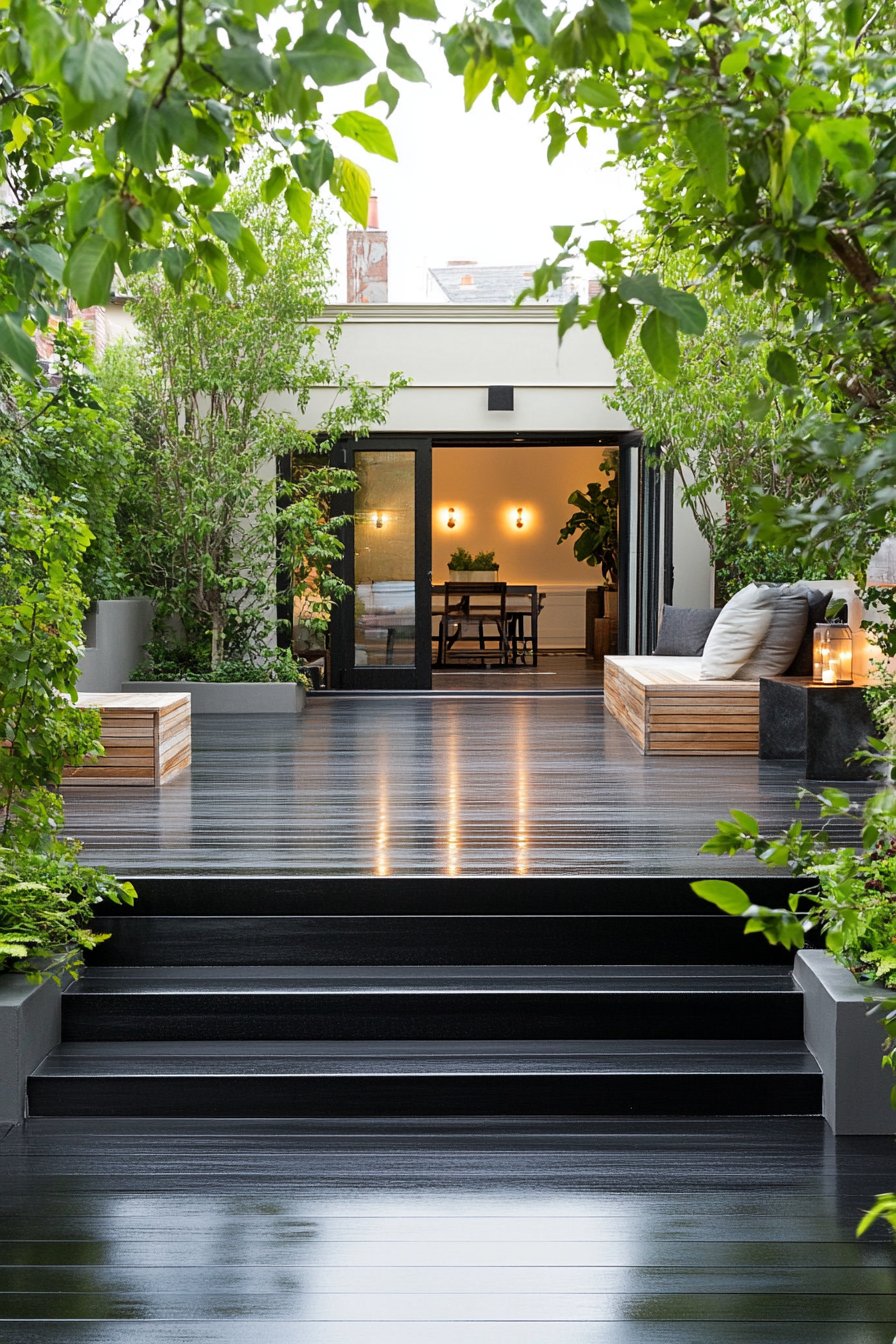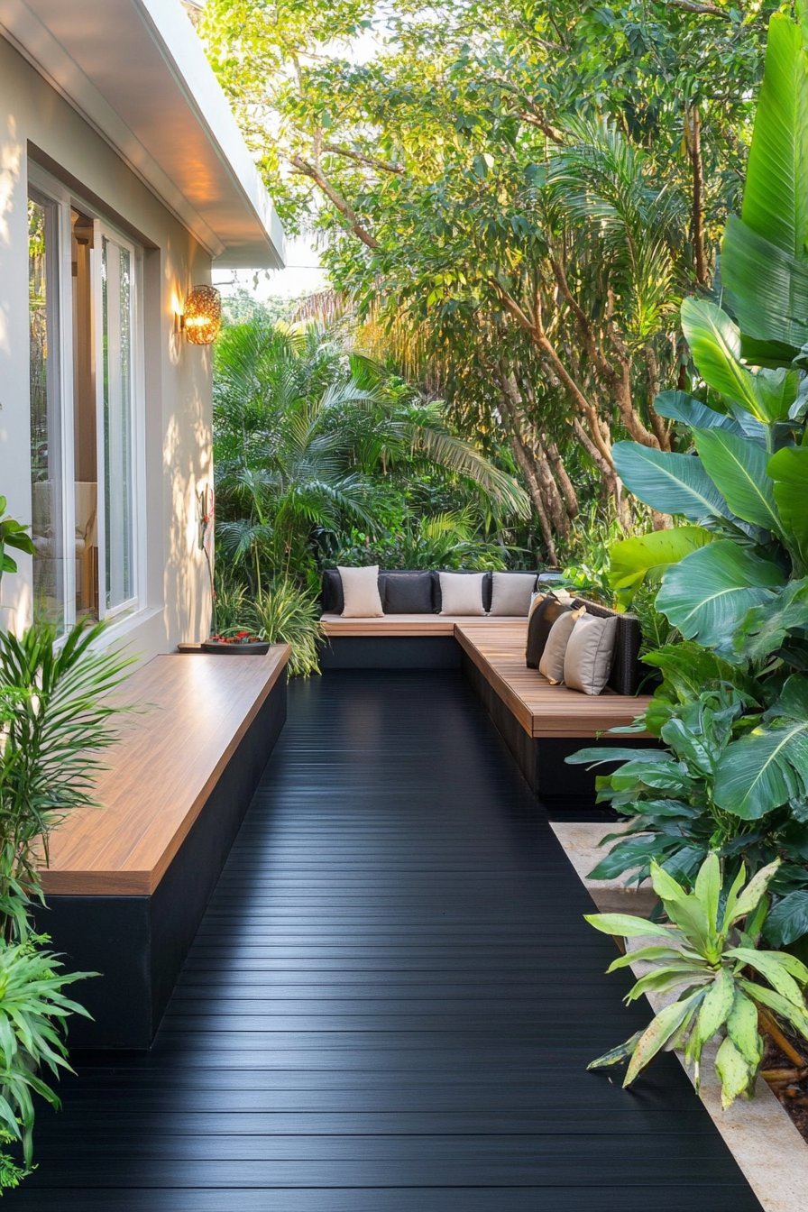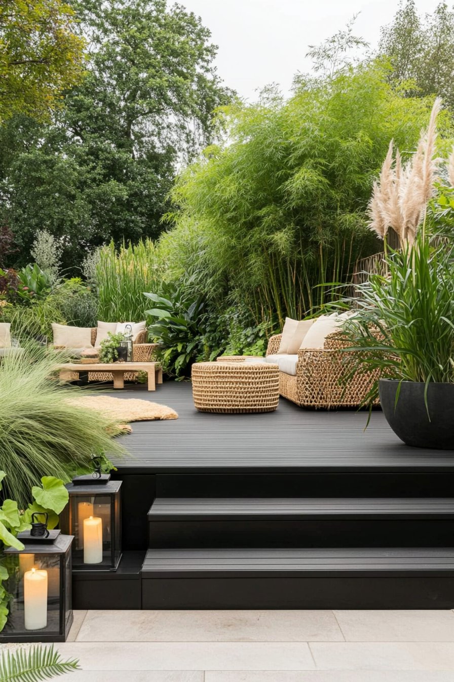 I absolutely adore this design, where the lush greenery of banana plants and ferns creates a vibrant contrast against the sleek, dark decking. The cozy seating area, adorned with plush cushions in neutral tones, invites relaxation, while the warm glow from lanterns adds an enchanting ambiance, perfect for evening gatherings.