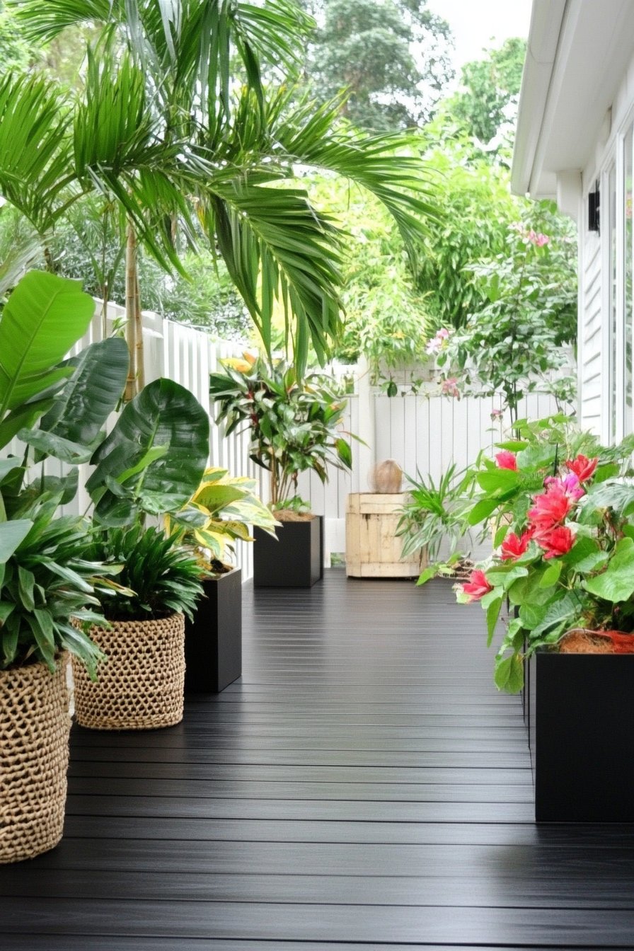 I absolutely adore the seamless blend of lush greenery and modern design elements in this garden. The vibrant foliage from plants like philodendrons and colorful hibiscus creates a tropical vibe, while the sleek black decking and textured natural fiber pots add a contemporary touch that elevates the overall aesthetic.