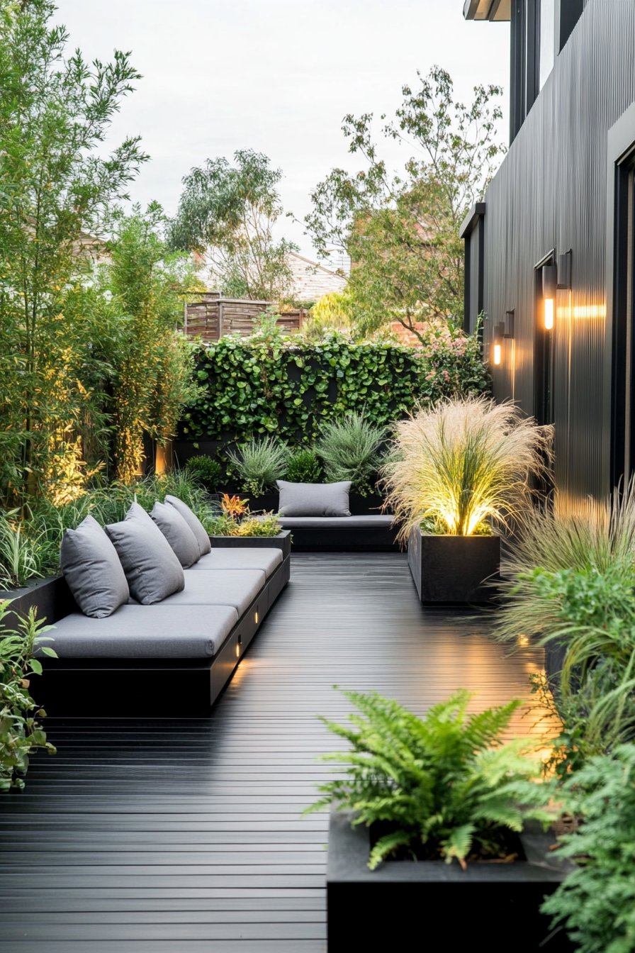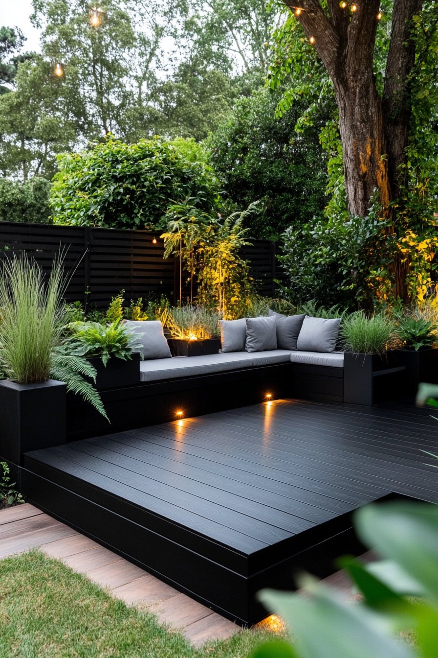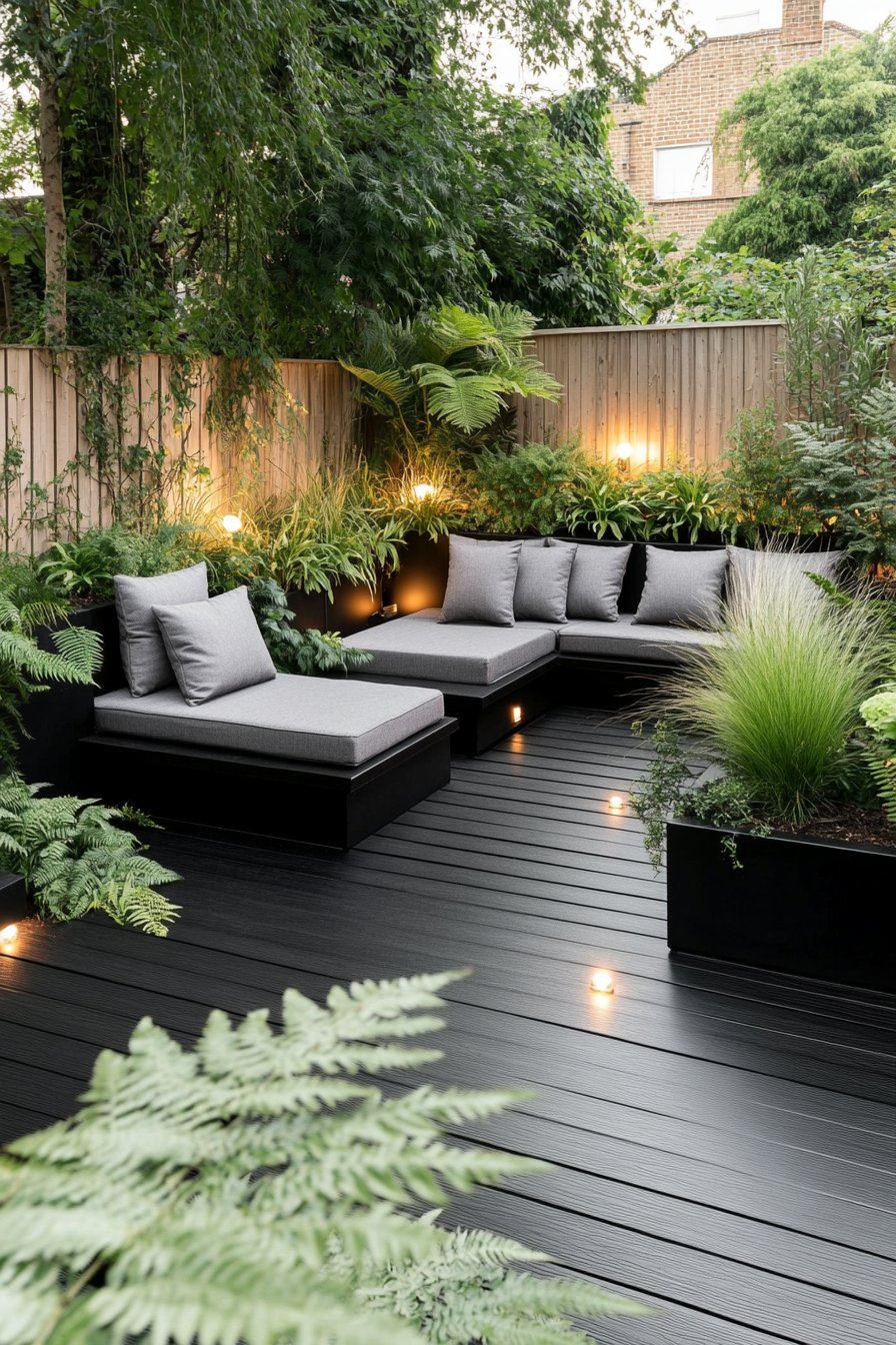 The sleek black decking and modern seating create a chic yet cozy atmosphere, perfect for relaxation and entertaining. I love how the lush greenery, featuring ferns and ornamental grasses, softens the space and adds a vibrant touch, while strategically placed lighting enhances the inviting ambiance.
