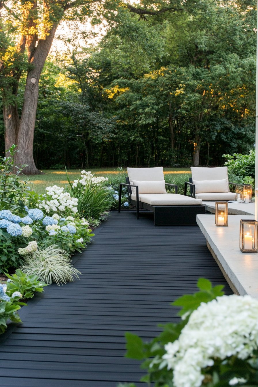 The blend of lush hydrangeas in soft blues and whites against the sleek, dark decking creates an inviting and tranquil atmosphere that feels both modern and serene. I love how the simple, clean lines of the lounge chairs complement the rich greenery, making it the perfect spot for relaxation.
