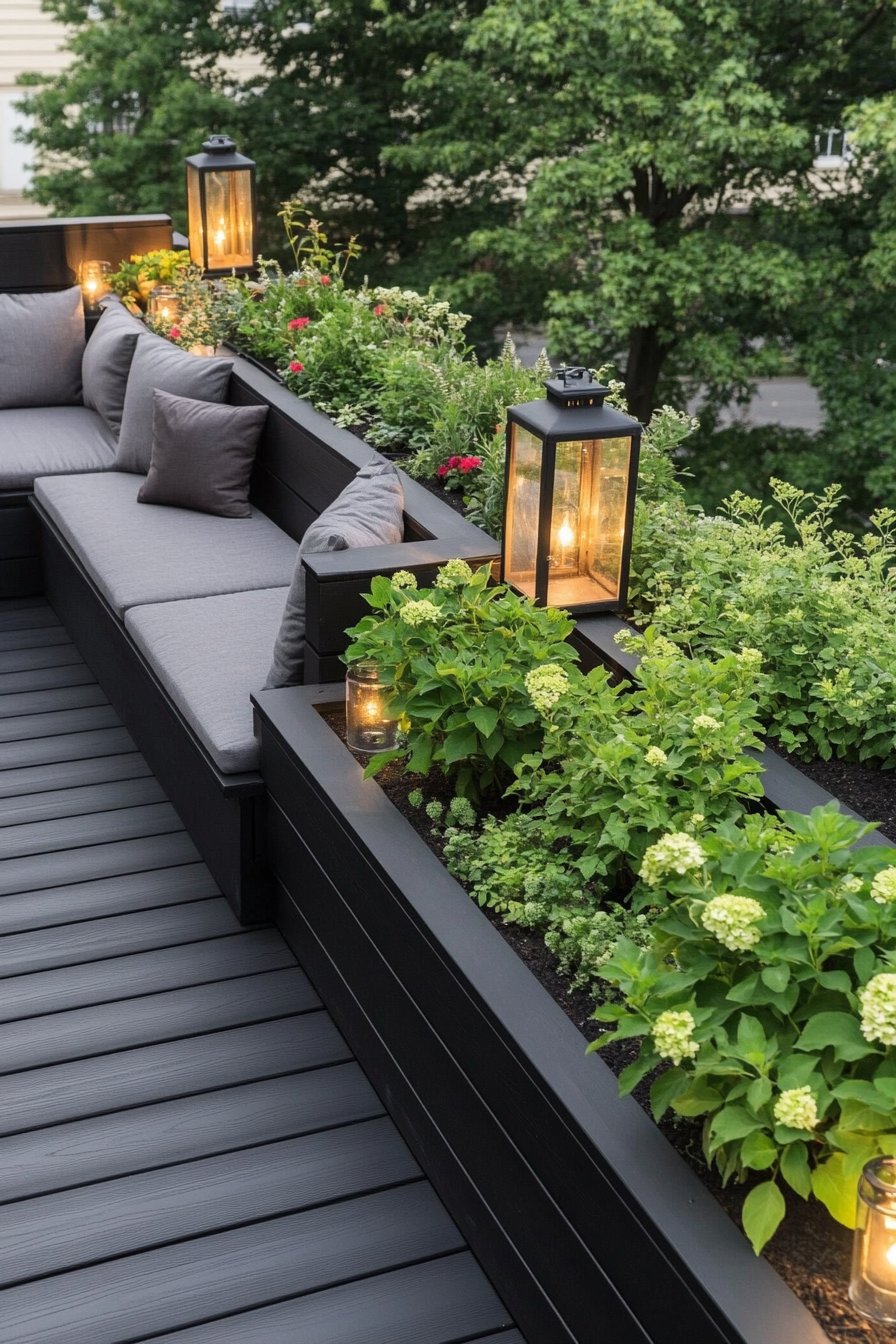 To achieve a similar look at home, consider using deep-colored furniture paired with low-maintenance evergreen hedges for privacy, while strategically placing lanterns to enhance the ambiance in the evening. Incorporating raised planters allows for a versatile planting scheme, ensuring both beauty and functionality in your outdoor oasis.