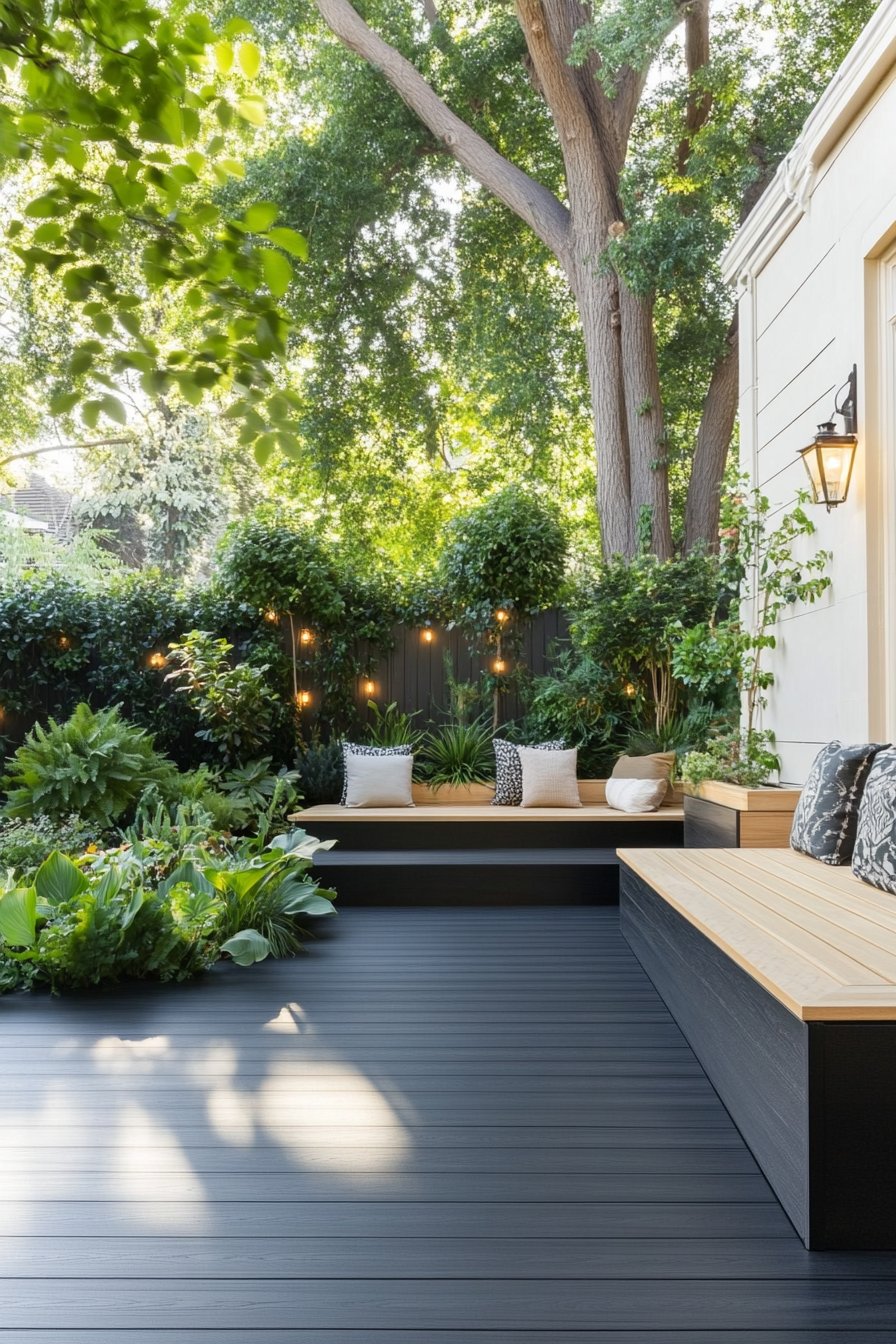 To achieve a similar look at home, consider using dark wood or composite materials for your deck and incorporating low-maintenance plants like ferns or lavender in stylish planters. Adding comfortable outdoor cushions and subtle lighting will elevate the cozy feel, making your garden a true retreat.