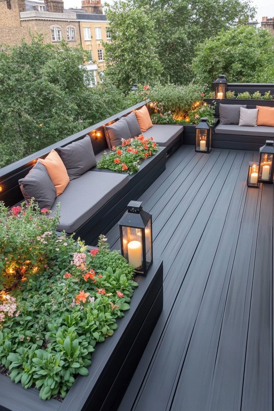 This design captures the essence of a cozy urban retreat with its sleek black decking and lush, colorful plantings that create a vibrant yet serene atmosphere. The combination of cheerful geraniums, delicate impatiens, and verdant ground cover brings life to the space, while the warm glow of lanterns adds a magical touch for evening relaxation.