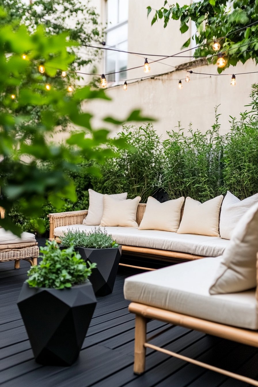 To recreate this enchanting space at home, focus on selecting a mix of soft seating with textured cushions and complement it with modern planters in geometric shapes for a stylish contrast. Incorporate warm outdoor lighting, such as string lights, to create an inviting ambiance, perfect for evening gatherings.