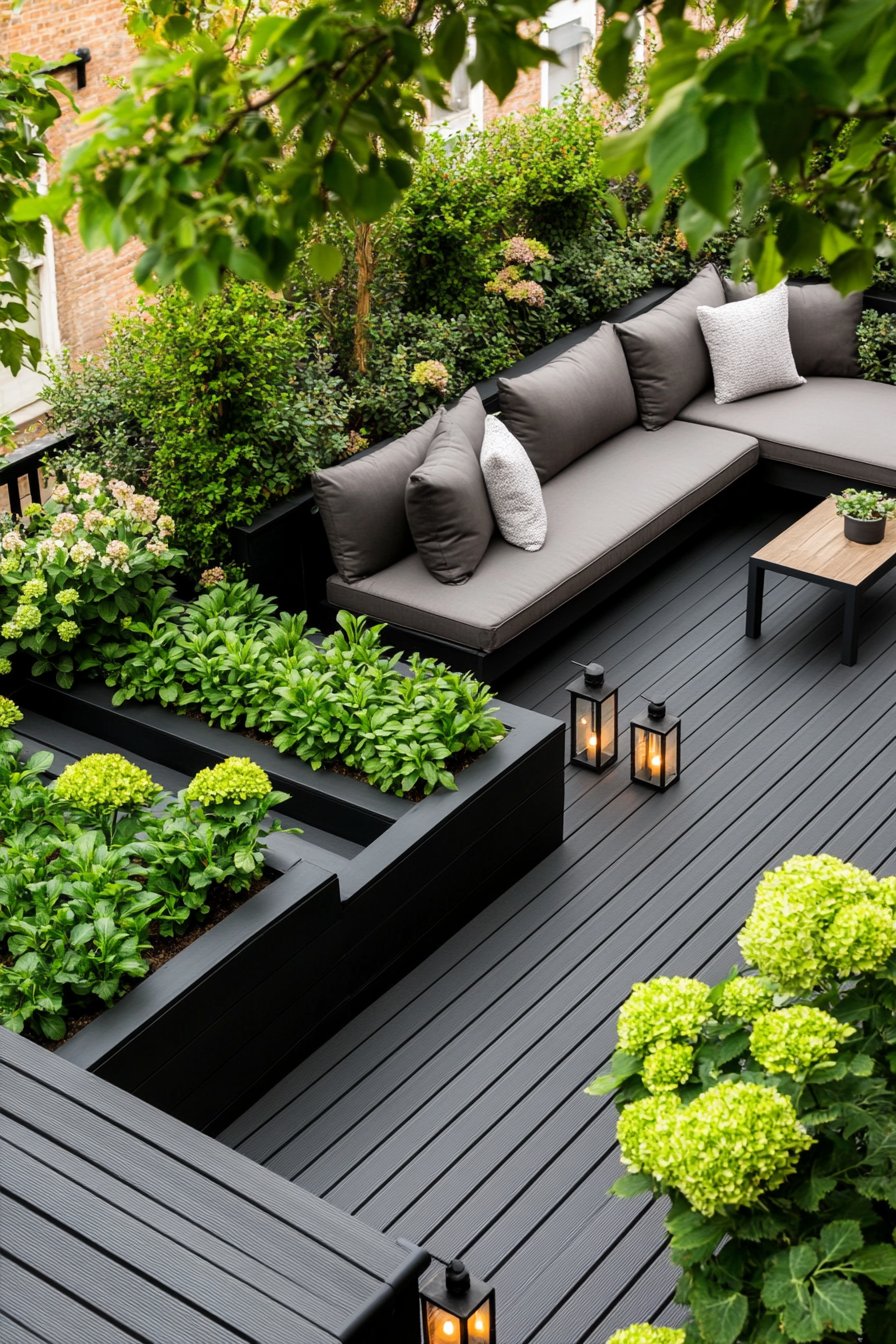 This garden design is a stunning blend of contemporary style and cozy comfort, featuring a sleek black decking that contrasts beautifully with lush greenery. I love the use of geometric planters filled with fragrant herbs like basil and mint, which not only add visual interest but also invite delightful scents that enhance the outdoor experience.