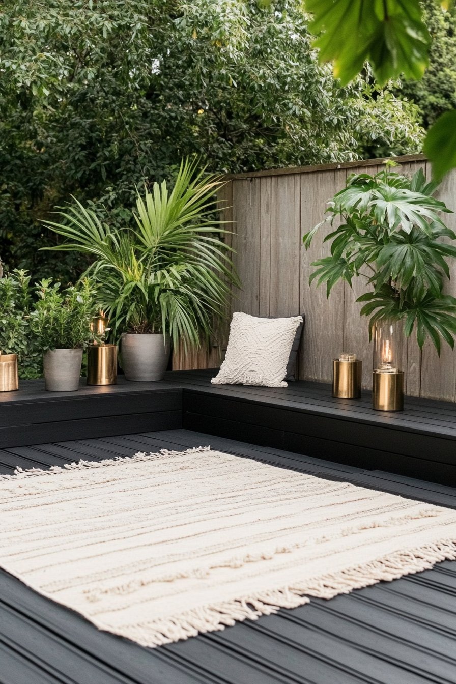 The design beautifully combines sleek black decking with lush tropical plants, creating a serene and inviting relaxation space. I adore the mix of textures, from the soft, woven rug to the polished metal accents, complemented by vibrant greenery like palms and monstera, which add a refreshing touch.