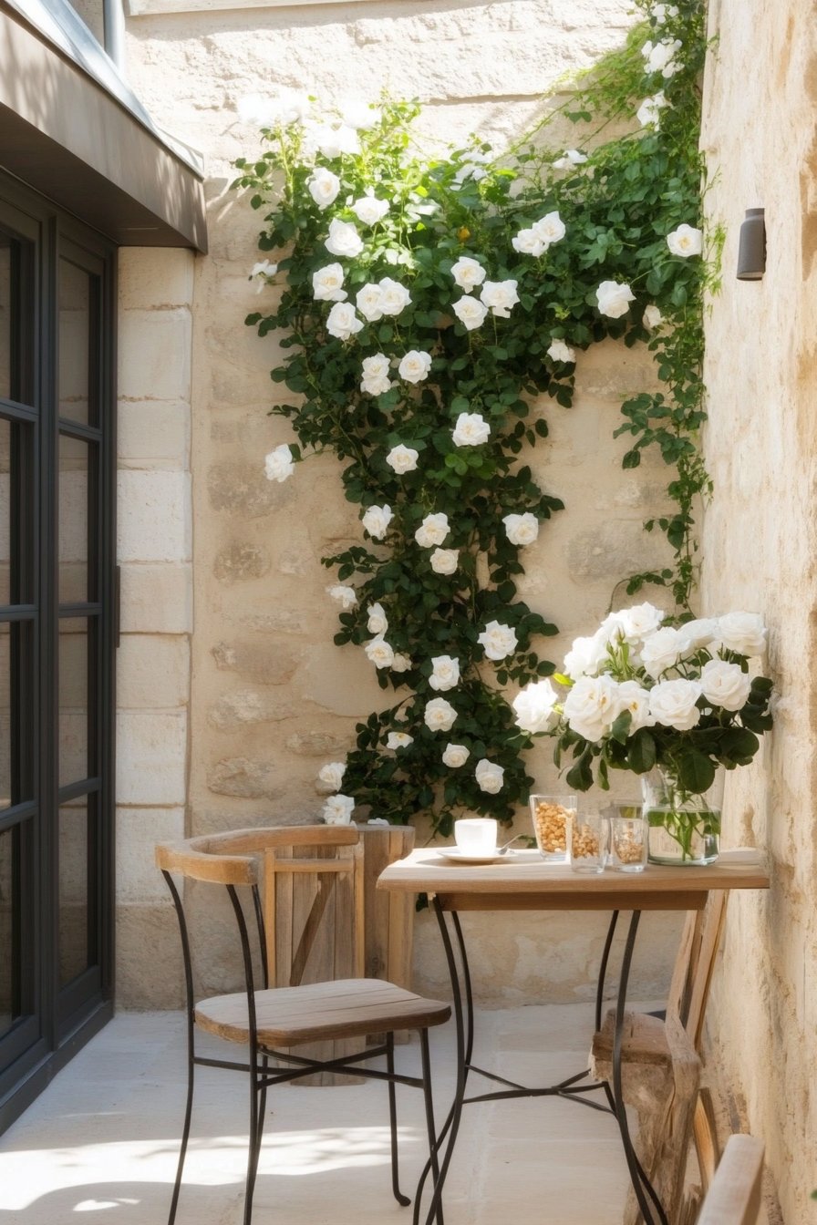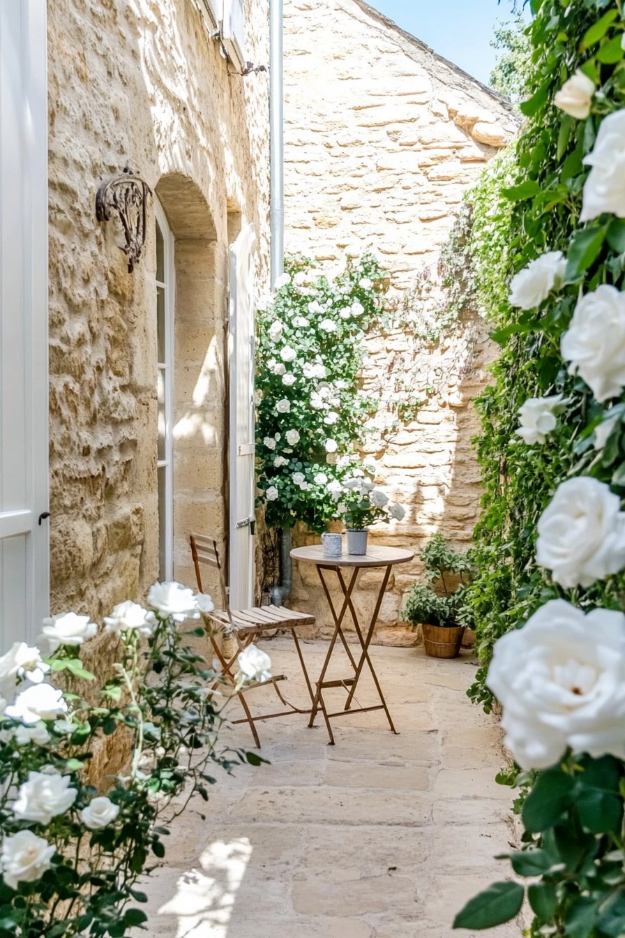 To achieve a similar look at home, consider planting climbing white roses along walls or trellises for added vertical interest, and mix in lush greenery for contrast. A simple seating area with a small table can transform your space into a cozy retreat, perfect for enjoying a morning coffee or evening relaxation.