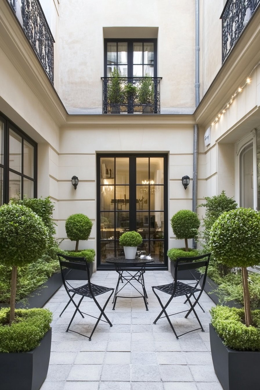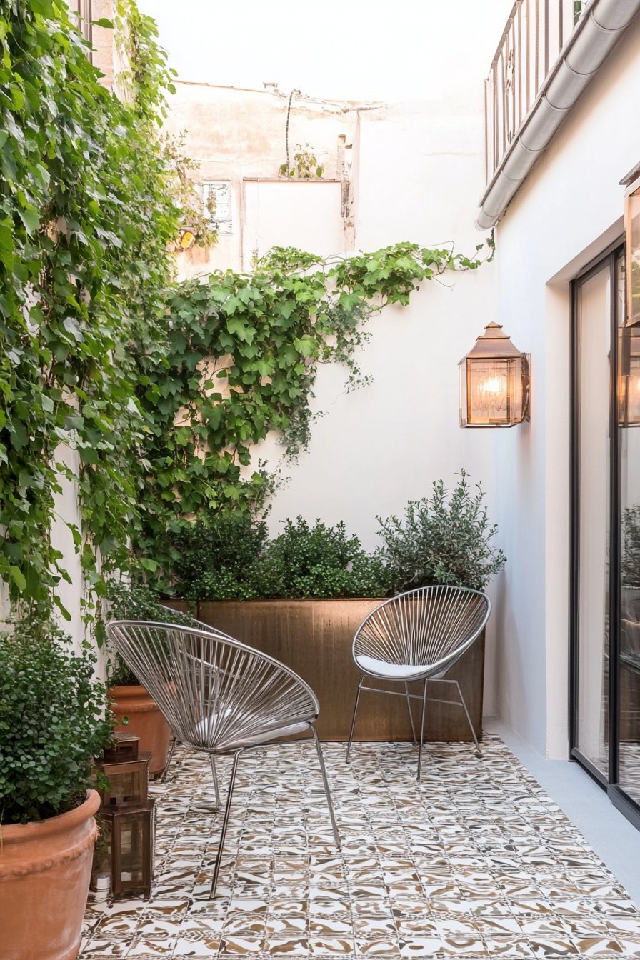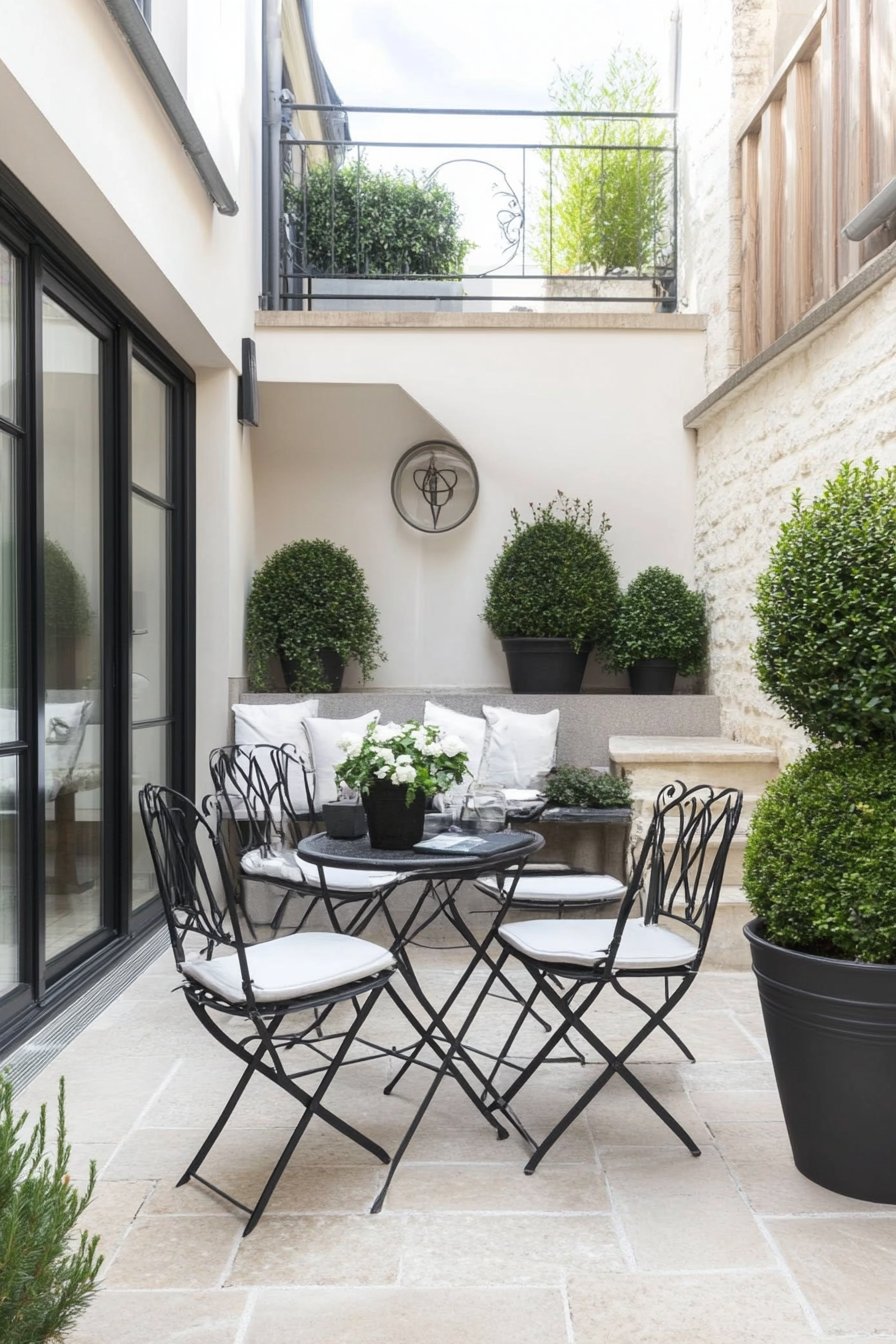 To replicate this look at home, consider using low-maintenance plants like boxwoods or ferns in stylish planters, and choose a simple bistro set for seating. Incorporating soft lighting, such as string lights or lanterns, can enhance the ambiance, making your outdoor area a serene oasis amidst the hustle and bustle of urban life.