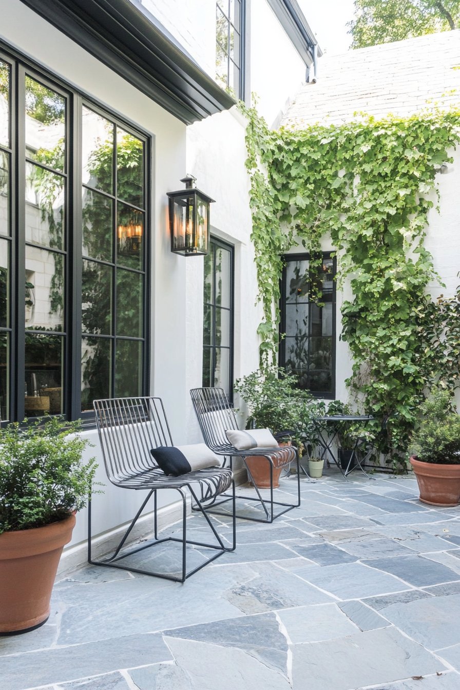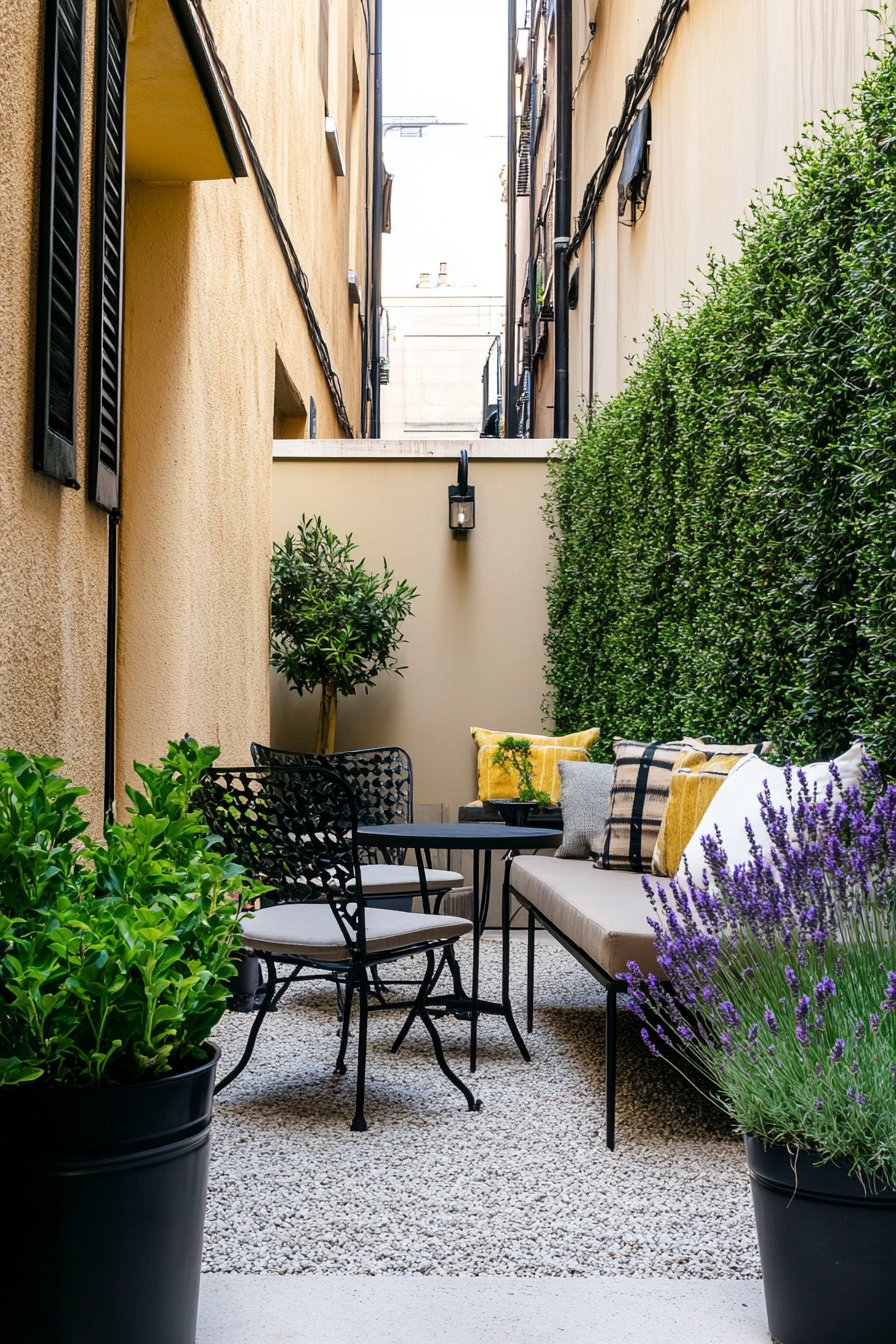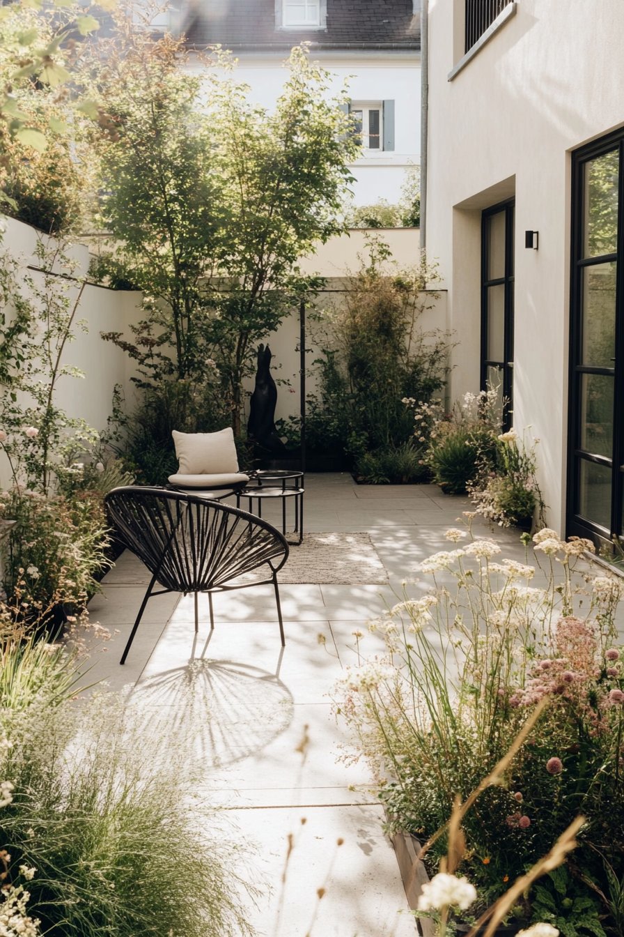 To replicate this look at home, consider using low-maintenance plants like boxwoods or ferns in stylish planters, and choose a simple bistro set for seating. Incorporating soft lighting, such as string lights or lanterns, can enhance the ambiance, making your outdoor area a serene oasis amidst the hustle and bustle of urban life.