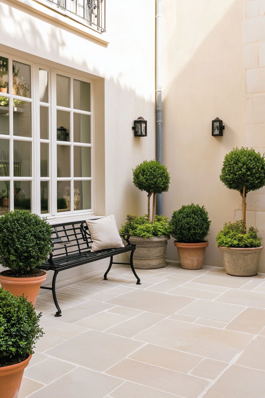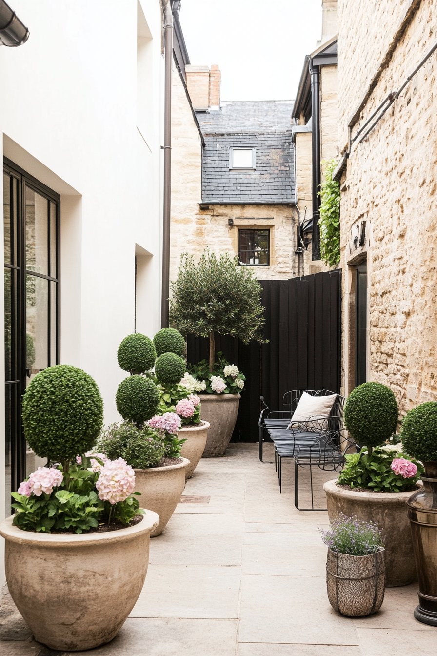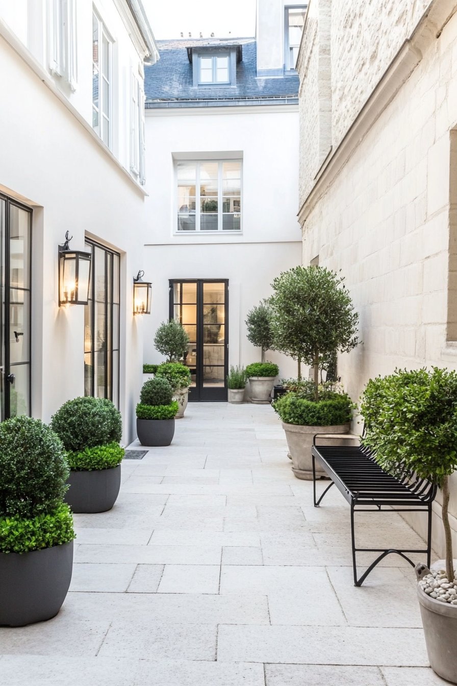 To achieve a similar look at home, consider incorporating a variety of potted plants, such as lavender or small ferns, alongside your boxwoods to introduce texture and fragrance. Opt for a neutral stone or light-colored paving to keep the space feeling open and airy, and don’t forget to add subtle lighting to highlight the beauty of your plants during the evening hours.