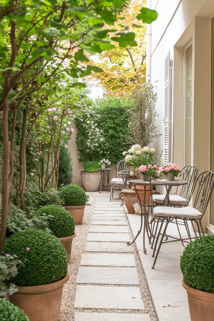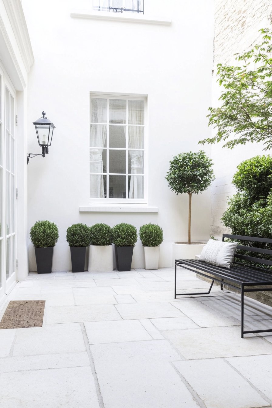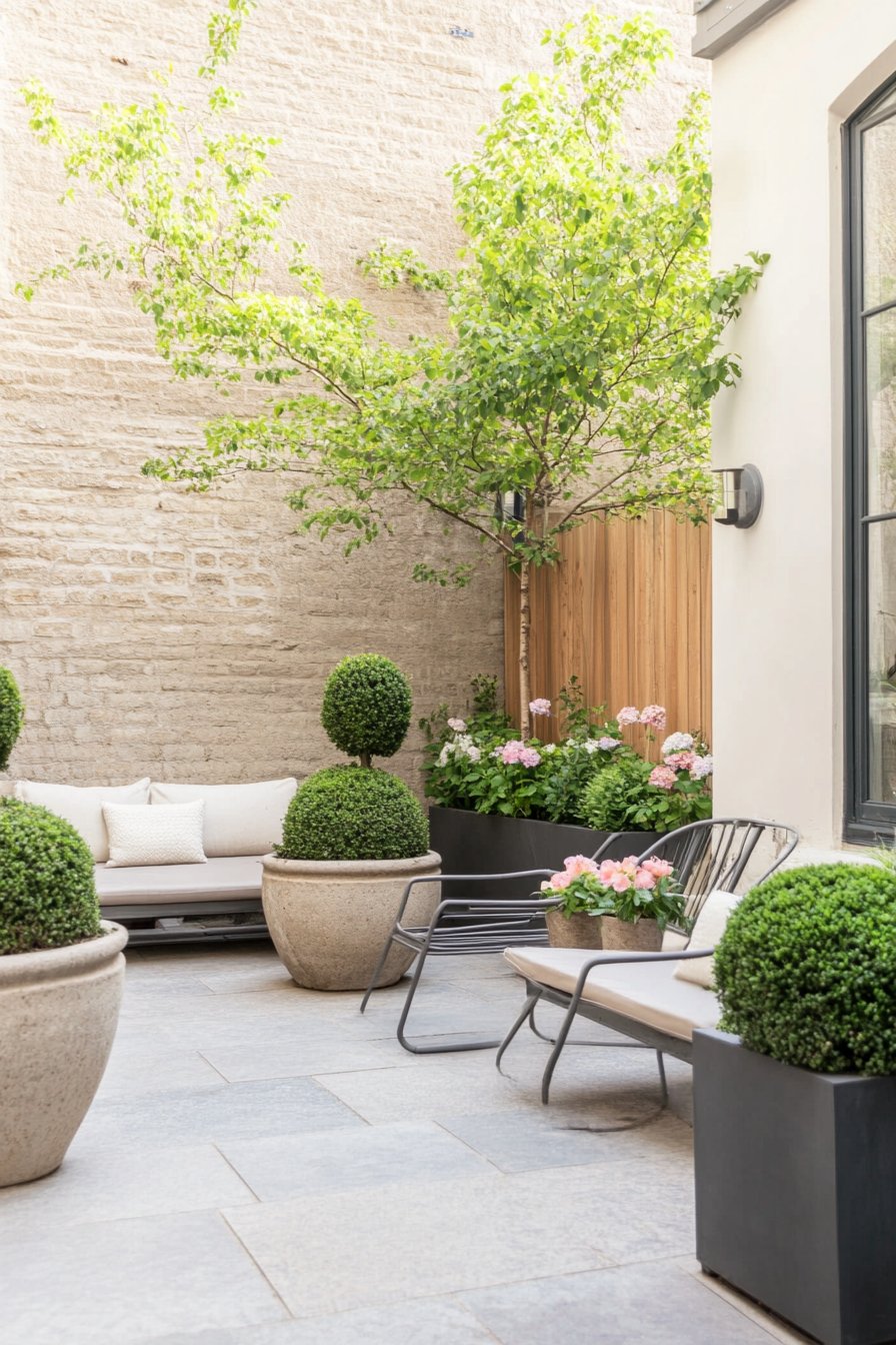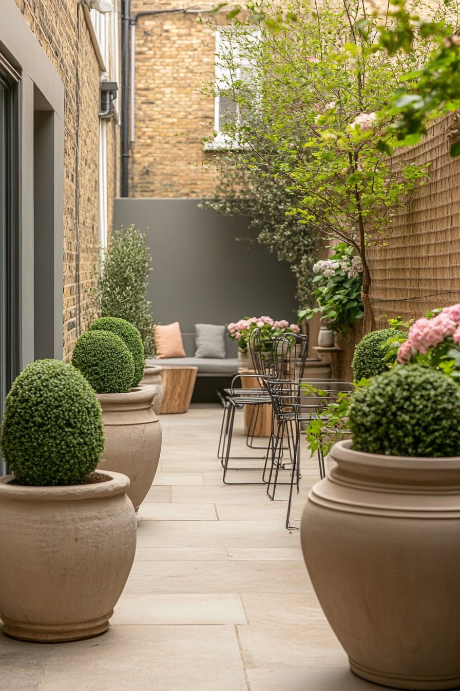To achieve a similar look at home, consider incorporating a variety of potted plants, such as lavender or small ferns, alongside your boxwoods to introduce texture and fragrance. Opt for a neutral stone or light-colored paving to keep the space feeling open and airy, and don’t forget to add subtle lighting to highlight the beauty of your plants during the evening hours.